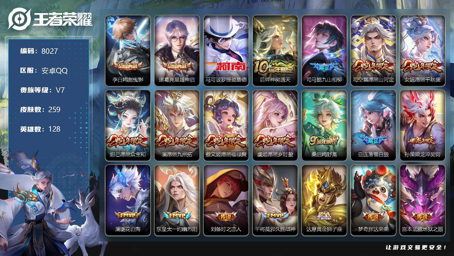 PX_2548892-编号A00568,可二次,V7,259皮肤,2典藏,1珍品传说,18传说,星域神启,鸣剑·曳影,怪盗基德,愿照·福禄聚,愿照·众生和,愿照·千秋盛,愿照·九州拓,愿照·山河定,愿照·岁时盈,九山相柳,乘龙·淬吴钩,默契交锋,前尘,踏浪烽翎,灼幽烈阳,落雪白狼,九幽镇关,逐花归海,画中游,鸣野蒿,神树通天,鹤鸣心笺,久胜战神,黄金狮子座,地狱之眼,胖达荣荣,径山谋武