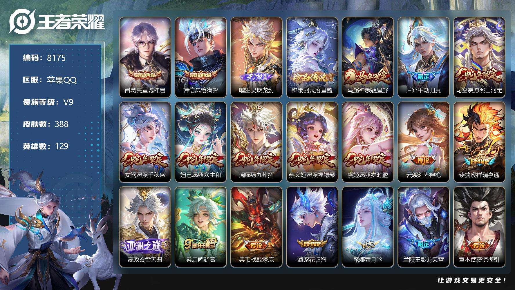 PX_2554636-编号A00755,可二次,V9,388皮肤,2典藏,1无双,1珍品传说,39传说,器灵·螭龙剑,弑枪猎影,星域神启,器灵·落星盏,至尊宝,白虎志,凤求凰,神骥·逐星野,愿照·福禄聚,愿照·众生和,愿照·千秋盛,愿照·九州拓,愿照·山河定,愿照·岁时盈,祈雪灵祝,默契交锋,前尘,绛天战甲,启明星使,吕布-末日机甲,武圣,音你闪耀,云鹰飞将,踏浪烽翎,千劫归真,霜月吟,惊梅引,电玩·雷克斯,影龙天霄,