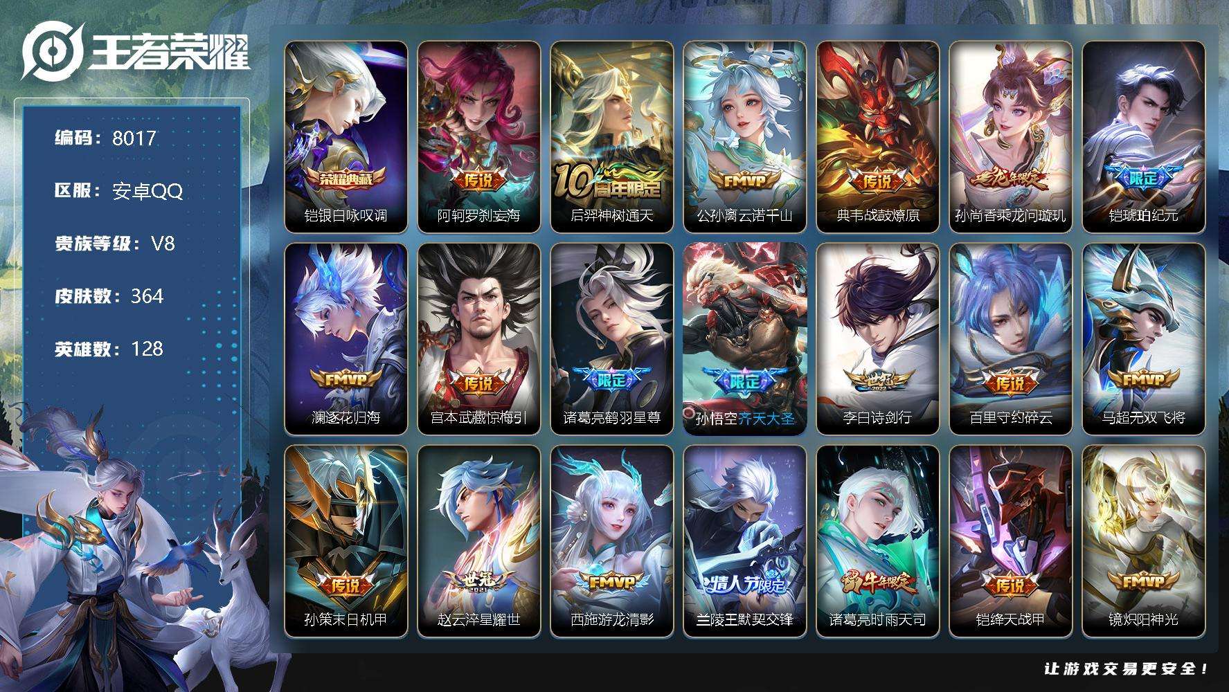 PX_2546419-实名:,不可修改,贵族等级:,V9,英雄数:,128,皮肤数:,441,荣耀水晶:,星空梦想,无限飓风号,银白咏叹调,珍品传说:,怪盗基德,星传说:,幽冥之眼,星际治安官,寅虎·焰心,传说皮:,黄金狮子座,黄金射手座,冠军飞将,黄金白羊座,久胜战神,一念神魔,末日机甲-孙尚香,音你心动-小乔,地狱之眼,李逍遥,乞巧织情,时之恋人-刘备,超时空战士-狄仁杰,挚爱之约,神树通天,限定皮:,冰锋战神,遇见飞天,李小龙,游园惊梦,梁祝,御风骁将,引擎之心,魔法小厨娘,辉光之辰,天魔缭乱,蜜橘之夏,乒乒小将,太华,青春决赛季,天狼狩猎者,冰霜恋舞曲,逐梦之影,逐梦之光,神奇女侠,天狼绘梦者,青龙志,瑞麟志,梅西,至尊宝,一生所爱,武陵仙君,大圣娶亲,寅虎·瑞焰,霸王别姬-项羽,高山流水,孙行者,匿光追影者,傲雪梅枪,玉兔公主,五谷丰年,鸣野蒿,逐霄战戟,亮点:,【精品号手慢无】需要消耗任意点券恢复V9!个性按键4,亲密玫瑰500+,积分夺宝25