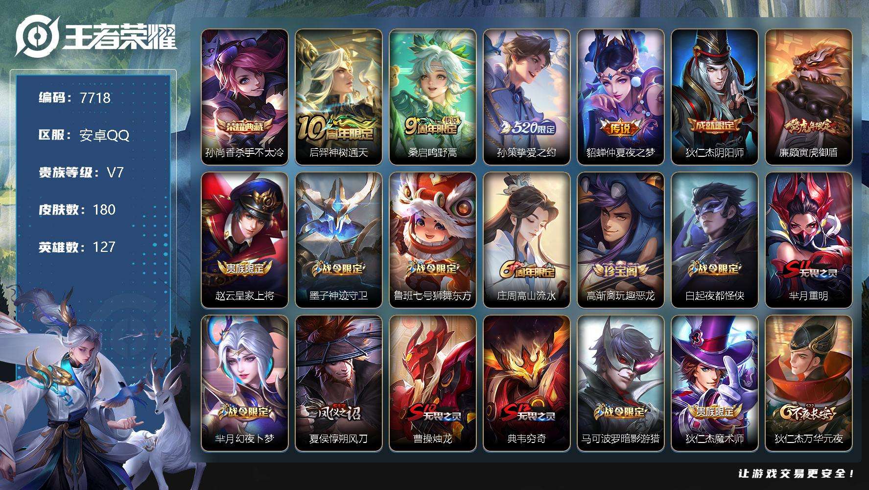 PX_2545943-编号***,可二次,V7,180皮肤,1典藏,4传说,杀手不太冷,神威,挚爱之约,寅虎·御盾,冰锋战神,仲夏夜之梦,鸣野蒿,玩趣恶龙,女武神,暗影游猎,航海奇遇记,冰冠公主,李小龙,特工魅影,曙光守护者,修罗,水晶猎龙者,白龙吟