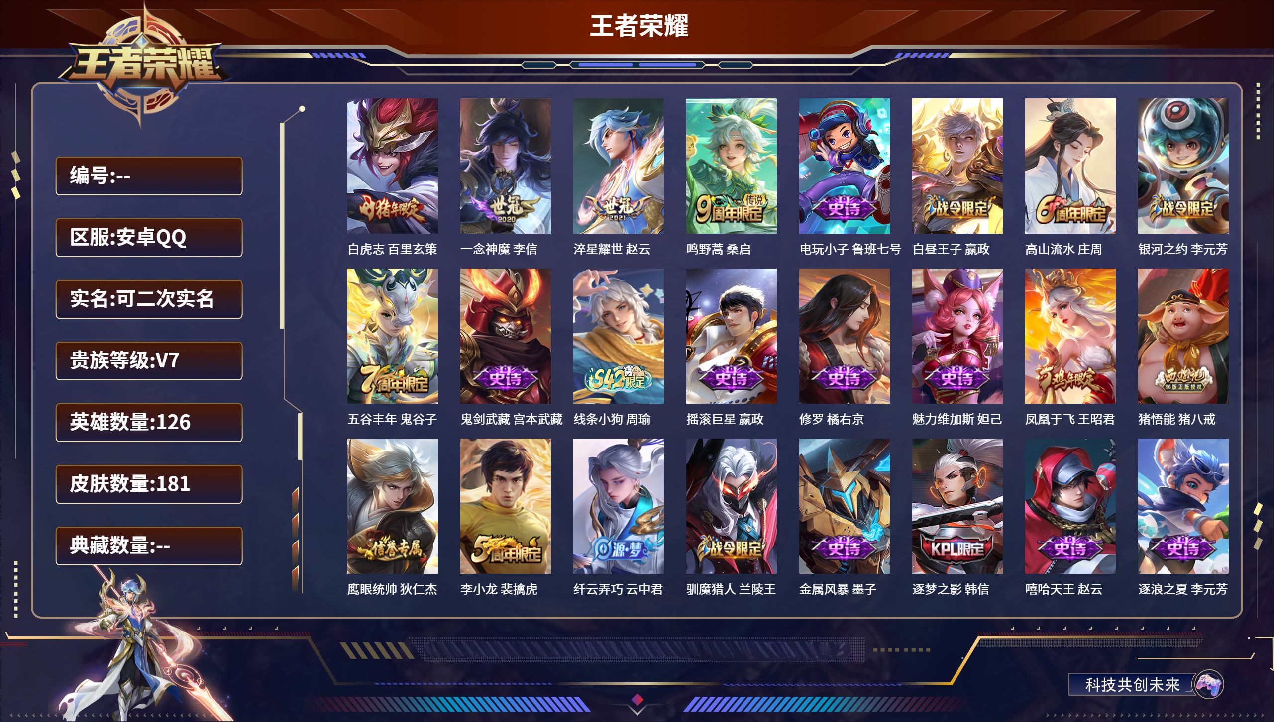 PX_2504126-安卓QQ/荣耀黄金/181皮肤/126英雄/0典藏/0珍品无双/0无双/0珍品传说/4传说/37史诗/7稀有英雄 【4,传说皮肤】白虎志,百里玄策,一念神魔,李信,淬星耀世,赵云,鸣野蒿,桑启, 【37,史诗皮肤】电玩小子,鲁班七号,白昼王子,嬴政,高山流水,庄周,银河之约,李元芳,五谷丰年,鬼谷子,鬼剑武藏,宫本武藏,线条小狗,周瑜,摇滚巨星,嬴政,修罗,橘右京,魅力维加斯,妲己,凤凰于飞,王昭君,猪悟能,猪八戒,鹰眼统帅,狄仁杰,李小龙,裴擒虎,纤云弄巧,云中君,驯魔猎人,兰陵王,金属风暴,墨子,逐梦之影,韩信,嘻哈天王,赵云,逐浪之夏,李元芳,引擎之心,赵云,石田雨龙,后羿,魔术师,狄仁杰,神威,马超,皇家上将,赵云,至尊宝,孙悟空,梁祝,上官婉儿,水晶猎龙者,花木兰,千年之狐,李白,节奏热浪,阿轲,曙光守护者,铠,绅士熊喵,刘禅,缤纷独角兽,小乔,蓝屏警告,典韦,时之恋人,孙尚香,水果甜心,孙尚香,暗隐猎兽者,兰陵王, 【95,勇者皮肤】烛龙,曹操,爱心护理,阿轲,沙漠行僧,达摩,大漠名商,沈梦溪,缤纷绘卷,张良,纽约教父,刘备,拳王,达摩,大发明家,达摩,功夫炙烤,廉颇,沉稳之力,孙尚香,海盐诗旅,桑启,朔风刀,夏侯惇,醍醐杖,老夫子,朔望之晖,女娲,归虚梦演,孙膑,汉昭烈帝,刘备,白色死神,白起,御旌,牛魔,阴阳师,狄仁杰,炼金王,扁鹊,径山谋武,孙权,次元突破,哪吒,科学大爆炸,项羽,功夫老勺,老夫子,鲨炮海盗猫,沈梦溪,海滩派对,项羽,万华元夜,狄仁杰,无尽征程,廉颇,演武夺筹,程咬金,红桃皇后,芈月,猎兽之王,吕布,哥特玫瑰,露娜,守护之力,大乔,无双福将,程咬金,原初探秘者,鬼谷子,星空之诺,沈梦溪,潮玩探月行,猪八戒,天穹祈灯,鬼谷子,化身博士,扁鹊,五福同心,张飞,次元傲视,杨戬,星际陆战队,程咬金,幻乐之宴,鬼谷子,东方不败,武则天,霸王丸,宫本武藏,虹云星官,明世隐,赤莲之焰,周瑜,死亡骑士,亚瑟,玩偶对对碰,安琪拉,掌控之力,诸葛亮,海滩丽影,钟无艳,忍·炎影,赵云,狰,白起,雪境奇遇,西施,重明,芈月,炽热元素使,姜子牙,坚韧之力,苏烈,乓乓大师,鲁班大师,妖精王,孙膑,天使之翼,孙膑,雾都夜雨,干将莫邪,玩趣恶龙,高渐离,兔女郎,花木兰,龙腾万里,关羽,金庭之子,兰陵王,未来纪元,宫本武藏,千军破阵,苏烈,花好人间,甄姬,万象初新,宫本武藏,御銮,盾山,秘密基地,刘禅,穷奇,典韦,教廷特使,韩信,黑猫爱糖果,李元芳,街头霸王,韩信,云中旅人,李元芳,重装意志,盘古,凯尔特女王,虞姬,少女阿狸,妲己,混沌棋,弈星,御霄,米莱狄,蔚蓝守将,蒙恬,幻想奇妙夜,王昭君,驱傩正仪,钟馗,特工战影,狂铁,御狮,狂铁,班班快跑,鲁班七号,饕餮,太乙真人,铁骨偃魂,典韦,熔金海岸,周瑜,苍林狼骑,苍,天穹之誓,姜子牙,鹤鸣心笺,艾琳,线条小狗,周瑜,噬灭天穹,东皇太一, 【46,其他皮肤】伊势巫女,大乔,战争骑士,夏侯惇,芝加哥教父,黄忠,三太子,哪吒,棒球奇才,沈梦溪,极冰防御线,盾山,生化警戒,钟无艳,花见巫女,伽罗,第七人偶,干将莫邪,万圣前夜,小乔,灼热之刃,李信,熊喵少女,阿古朵,海之征途,孙策,火炮千金,孙尚香,福禄兄弟,鲁班七号,精灵王,后羿,冰刃幻境,镜,星航指挥官,诸葛亮,魇语军师,司马懿,英喵野望,刘禅,午夜歌剧院,元歌,启蛰,司空震,隐刃,兰陵王,异域舞娘,貂蝉,剑舞者,花木兰,归虚梦演,蒙犽,激情绿茵,马可波罗,埃及法老,杨戬,画中游,桑启,年年有余,猪八戒,锦衣卫,狄仁杰,一千零一夜,张良,归虚梦演,曜,威尼斯狂欢,百里玄策,幸存者,马超,战争女神,雅典娜,创世神祝,盘古,绝影神枪,百里守约,蔷薇王座,蔡文姬,孤猎,澜,精准探案法,米莱狄,精灵公主,王昭君,赤焰之缨,云缨,露花倒影,嫦娥,地府判官,钟馗,美梦成真,梦奇, 【7,稀有英雄】不知火舞,橘右京,夏洛特,娜可露露,韩信,艾琳,赵云, 营地ID:,