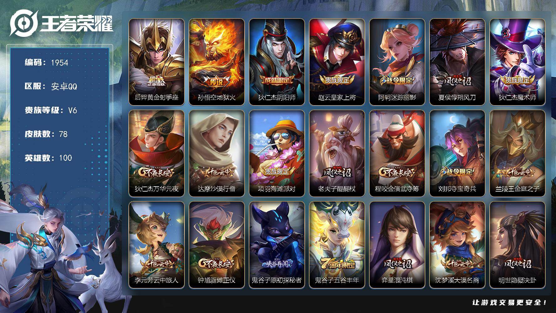 PX_2480578-Q-V6-荣耀黄金II段位-100英雄-78皮肤-2传说-13史诗,打野21段 【传说皮肤】:后羿黄金射手座,孙悟空地狱火 【限定皮肤】:狄仁杰阴阳师,赵云皇家上将,阿轲迷踪丽影,夏侯惇朔风刀,狄仁杰魔术师,狄仁杰万华元夜,达摩沙漠行僧,项羽海滩派对,老夫子醍醐杖,程咬金演武夺筹,刘邦夺宝奇兵,兰陵王金庭之子,李元芳云中旅人,钟馗驱傩正仪,鬼谷子原初探秘者,鬼谷子五谷丰年,弈星混沌棋,沈梦溪大漠名商,明世隐疑决卦,裴擒虎擒涛扼浪,盾山御銮,上官婉儿梁祝,鲁班大师探海日志,张良古海寻踪,鬼谷子天穹祈灯 【赛季限定】:盾山御銮,夏侯惇朔风刀,弈星混沌棋,明世隐疑决卦,老夫子醍醐杖,鬼谷子原初探秘者,狄仁杰万华元夜,程咬金演武夺筹,钟馗驱傩正仪,达摩沙漠行僧,兰陵王金庭之子,沈梦溪大漠名商,李元芳云中旅人,裴擒虎擒涛扼浪,鲁班大师探海日志,张良古海寻踪,鬼谷子天穹祈灯 【战令限定】:阿轲迷踪丽影,刘邦夺宝奇兵 【史诗皮肤】:赵云皇家上将,甄姬冰雪圆舞曲,狄仁杰魔术师,孙尚香水果甜心,妲己魅力维加斯,吕布圣诞狂欢,李白千年之狐,兰陵王暗隐猎兽者,铠曙光守护者,狄仁杰鹰眼统帅,上官婉儿梁祝,阿轲迷踪丽影,鬼谷子五谷丰年 【其他皮肤】:项羽海滩派对,韩信教廷特使,韩信街头霸王,赵云白执事,赵云忍炎影,扁鹊化身博士,宫本武藏未来纪元,安琪拉玩偶对对碰,妲己少女阿狸,亚瑟死亡骑士,达摩拳王,花木兰兔女郎,甄姬花好人间,宫本武藏万象初新,狄仁杰阴阳师,关羽龙腾万里,钟无艳海滩丽影,宫本武藏霸王丸,苏烈坚韧之力,小乔丁香结,吕布野性能量,盾山御銮,夏侯惇朔风刀,弈星混沌棋,明世隐疑决卦,刘邦夺宝奇兵,盾山圆桌骑士,老夫子醍醐杖,鬼谷子原初探秘者,狄仁杰万华元夜,程咬金演武夺筹,钟馗驱傩正仪,鲁班大师乓乓大师,达摩沙漠行僧,兰陵王金庭之子,沈梦溪大漠名商,李元芳云中旅人,裴擒虎擒涛扼浪,鲁班大师探海日志,张良古海寻踪,后羿完美运算,鬼谷子天穹祈灯,鲁班七号福禄兄弟,鲁班七号木偶奇遇记,貂蝉异域舞娘,老夫子潮流仙人,狄仁杰锦衣卫,孙悟空西部大镖客,后羿精灵王,兰陵王隐刃,李白范海辛,马可波罗激情绿茵,大乔伊势巫女,铠龙域领主,百里守约绝影神枪,百里玄策威尼斯狂欢,裴擒虎街头旋风,元歌午夜歌剧院,伽罗花见巫女,李信灼热之刃,上官婉儿修竹墨客,盘古创世神祝,马超幸存者 【营地ID】:18