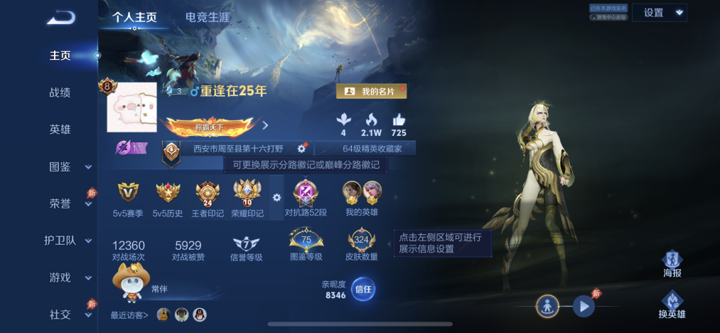 PX_2536906-实名:,可修改,贵族等级:,V4,英雄数:,126,皮肤数:,105,荣耀水晶:,最初的交响,星传说:,星际治安官,传说皮:,超时空战士-狄仁杰,限定皮:,遇见飞天,高山流水,鸣野蒿
