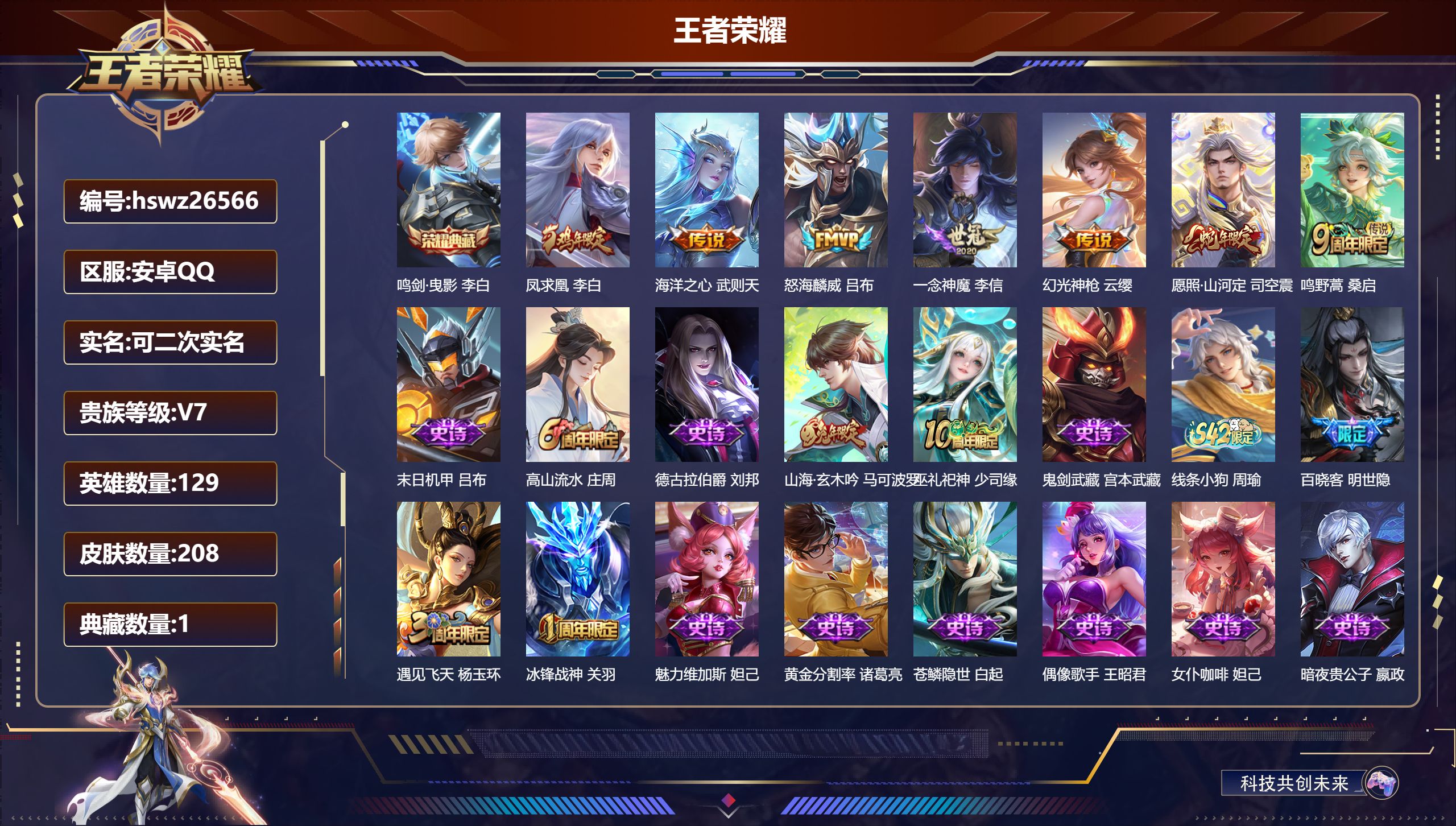 PX_2524288-Q/永恒钻石/208皮肤/129英雄/1典藏/0珍品无双/0无双/0珍品传说/7传说/45史诗/10稀有英雄 【1,典藏皮肤】鸣剑·曳影,李白, 【7,传说皮肤】凤求凰,李白,海洋之心,武则天,怒海麟威,吕布,一念神魔,李信,幻光神枪,云缨,愿照·山河定,司空震,鸣野蒿,桑启, 【45,史诗皮肤】末日机甲,吕布,高山流水,庄周,德古拉伯爵,刘邦,山海·玄木吟,马可波罗,巫礼祀神,少司缘,鬼剑武藏,宫本武藏,线条小狗,周瑜,百晓客,明世隐,遇见飞天,杨玉环,冰锋战神,关羽,魅力维加斯,妲己,黄金分割率,诸葛亮,苍鳞隐世,白起,偶像歌手,王昭君,女仆咖啡,妲己,暗夜贵公子,嬴政,鹰眼统帅,狄仁杰,纤云弄巧,云中君,降魔,墨子,灵蛊蚀心,扁鹊,魔术师,狄仁杰,龙之律动,狂铁,皇家上将,赵云,冰冠公主,雅典娜,至尊宝,孙悟空,功夫厨神,程咬金,梁祝,上官婉儿,圣诞恋歌,貂蝉,水晶猎龙者,花木兰,破空之剑,亚连,圣诞狂欢,吕布,地狱岩魂,廉颇,蔷薇恋人,孙尚香,冰雪圆舞曲,甄姬,千年之狐,李白,游园惊梦,甄姬,青春决赛季,花木兰,曙光守护者,铠,箭羽风息,伽罗,百相守梦,周瑜,王者之锤,钟无艳,线条小狗,小乔,水果甜心,孙尚香,幽灵船长,曹操,暗隐猎兽者,兰陵王, 【99,勇者皮肤】烛龙,曹操,爱心护理,阿轲,缤纷绘卷,张良,纽约教父,刘备,拳王,达摩,丁香结,小乔,功夫炙烤,廉颇,朔风刀,夏侯惇,醍醐杖,老夫子,汉昭烈帝,刘备,白色死神,白起,黄金武士,典韦,御旌,牛魔,阴阳师,狄仁杰,炼金王,扁鹊,致命风华,阿轲,次元突破,哪吒,古海寻踪,张良,科学大爆炸,项羽,功夫老勺,老夫子,鲨炮海盗猫,沈梦溪,虎啸剑宗,刘邦,海滩派对,项羽,完美运算,后羿,万华元夜,狄仁杰,制霸全明星,牛魔,演武夺筹,程咬金,西部游侠,莱西奥,哥特玫瑰,露娜,守护之力,大乔,无双福将,程咬金,原初探秘者,鬼谷子,潮玩探月行,猪八戒,天穹祈灯,鬼谷子,疑决卦,明世隐,如懿,安琪拉,化身博士,扁鹊,阿尔法小队,后羿,星际陆战队,程咬金,幻乐之宴,鬼谷子,东方不败,武则天,霸王丸,宫本武藏,虹云星官,明世隐,雾影缉谜,兰陵王,死亡骑士,亚瑟,敏锐之力,李白,玩偶对对碰,安琪拉,掌控之力,诸葛亮,海滩丽影,钟无艳,忍·炎影,赵云,狰,白起,雪境奇遇,西施,重明,芈月,炽热元素使,姜子牙,坚韧之力,苏烈,乓乓大师,鲁班大师,死亡摇滚,高渐离,溯影追猎,虞姬,妖精王,孙膑,雾都夜雨,干将莫邪,兔女郎,花木兰,龙腾万里,关羽,未来纪元,宫本武藏,罗小黑战记,哪吒,荣光之誓,亚瑟,万象初新,宫本武藏,时尚教父,姜子牙,秘密基地,刘禅,穷奇,典韦,教廷特使,韩信,黑猫爱糖果,李元芳,街头霸王,韩信,西部大镖客,孙悟空,凯尔特女王,虞姬,进击墨子号,墨子,少女阿狸,妲己,混沌棋,弈星,御霄,米莱狄,幻想奇妙夜,王昭君,驱傩正仪,钟馗,御狮,狂铁,白执事,赵云,饕餮,太乙真人,劲辣红锅,太乙真人,罗小黑战记,张良,铁骨偃魂,典韦,苍林狼骑,苍,天穹之誓,姜子牙,魅影绮裳,影,星梦巡礼,姜子牙,谧流熔炉,太乙真人,暗都幽影,大司命,鹤鸣心笺,艾琳,线条小狗,妲己,逆浪荇歌,甄姬,百相守梦,孙策,线条小狗,周瑜,噬灭天穹,东皇太一,灵卦秘语,少司缘, 【58,其他皮肤】前尘,金蝉,战争骑士,夏侯惇,圣殿之光,刘邦,芝加哥教父,黄忠,潮流仙人,老夫子,棒球奇才,沈梦溪,龙域领主,铠,死神来了,曹操,超能战警,曹操,花见巫女,伽罗,爱与和平,苏烈,第七人偶,干将莫邪,万圣前夜,小乔,灼热之刃,李信,熊喵少女,阿古朵,海之征途,孙策,火炮千金,孙尚香,木偶奇遇记,鲁班七号,福禄兄弟,鲁班七号,帝国元帅,项羽,精灵王,后羿,绯红之刃,露娜,星航指挥官,诸葛亮,魇语军师,司马懿,午夜歌剧院,元歌,启蛰,司空震,隐刃,兰陵王,花间舞,公孙离,异域舞娘,貂蝉,街头旋风,裴擒虎,东海龙王,东皇太一,剑舞者,花木兰,维京掠夺者,苍,占星师,明世隐,激情绿茵,马可波罗,埃及法老,杨戬,归虚梦演,西施,阿摩司公爵,鬼谷子,年年有余,猪八戒,尼罗河女神,女娲,锦衣卫,狄仁杰,威尼斯狂欢,百里玄策,战争女神,雅典娜,特种部队,李元芳,绝影神枪,百里守约,蔷薇王座,蔡文姬,森,瑶,孤猎,澜,加勒比小姐,虞姬,踏雪寻梅,弈星,精准探案法,米莱狄,赤焰之缨,云缨,露花倒影,嫦娥,地府判官,钟馗,美梦成真,梦奇,天启骑士,关羽,圆桌骑士,太乙真人,西部大镖客,孙悟空, 【10,稀有英雄】武则天,敖隐,嬴政,不知火舞,橘右京,夏洛特,娜可露露,韩信,艾琳,赵云, 营地ID:,