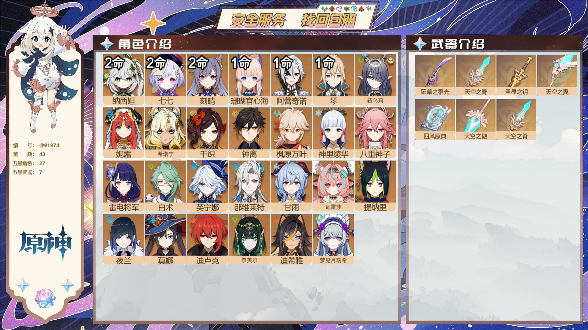 PX_2528475-,邮箱不出售,,冒险等级60级,女主,43黄,27个五星角色,7个五星武器,纠缠之源0--原石390--圣遗物519--【时装】,帆影游风,倩影游侠,雨化竹身, 【27个五星角色】,2命纳西妲,2命七七,2命刻晴,1命珊瑚宫心海,1命阿蕾奇诺,1命琴,0命菈乌玛,0命妮露,0命希诺宁,0命千织,0命钟离,0命枫原万叶,0命神里绫华,0命八重神子,0命雷电将军,0命白术,0命芙宁娜,0命那维莱特,0命甘雨,0命瓦雷莎,0命提纳里,0命夜兰,0命莫娜,0命迪卢克,0命奈芙尔,0命迪希雅,0命梦见月瑞希, 【7个五星武器】,精1薙草之稻光,精1天空之脊,精1圣显之钥,精1天空之翼,精1四风原典,精1天空之傲,精1天空之脊,3套, 【时装】,帆影游风,倩影游侠,雨化竹身,
