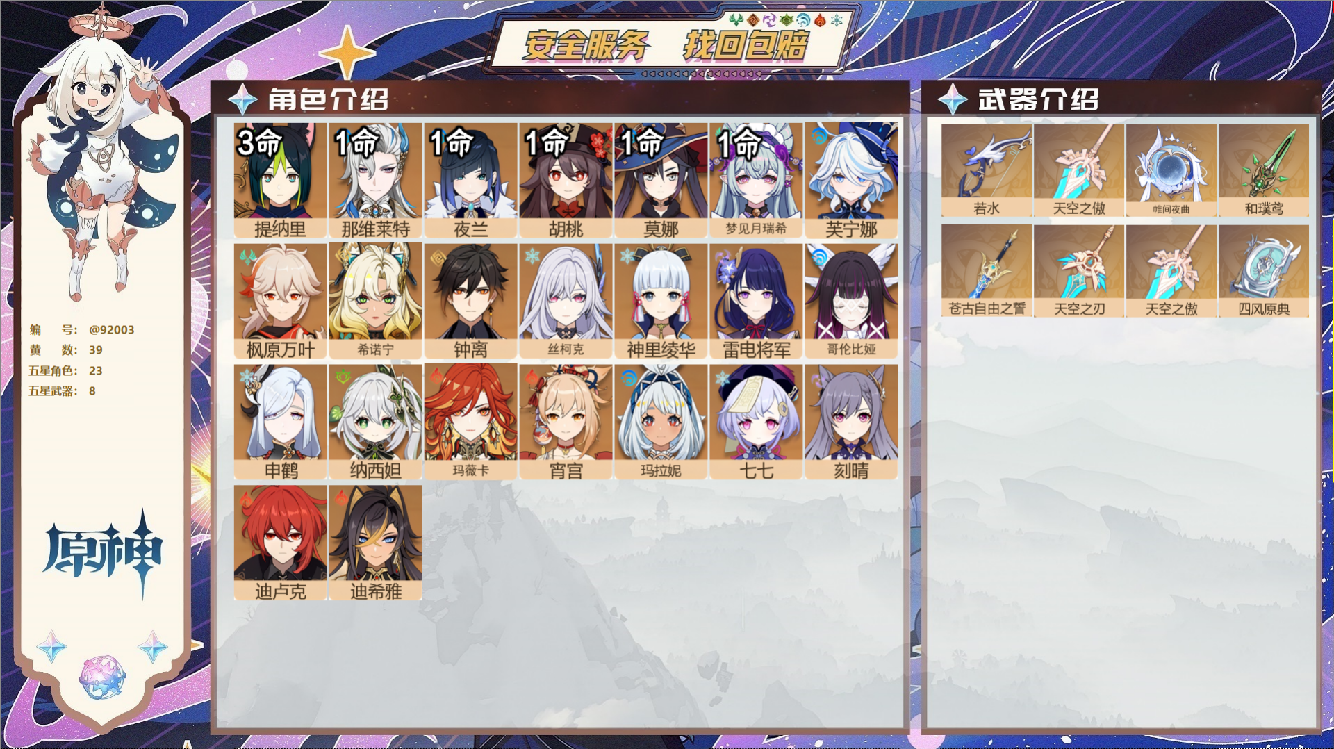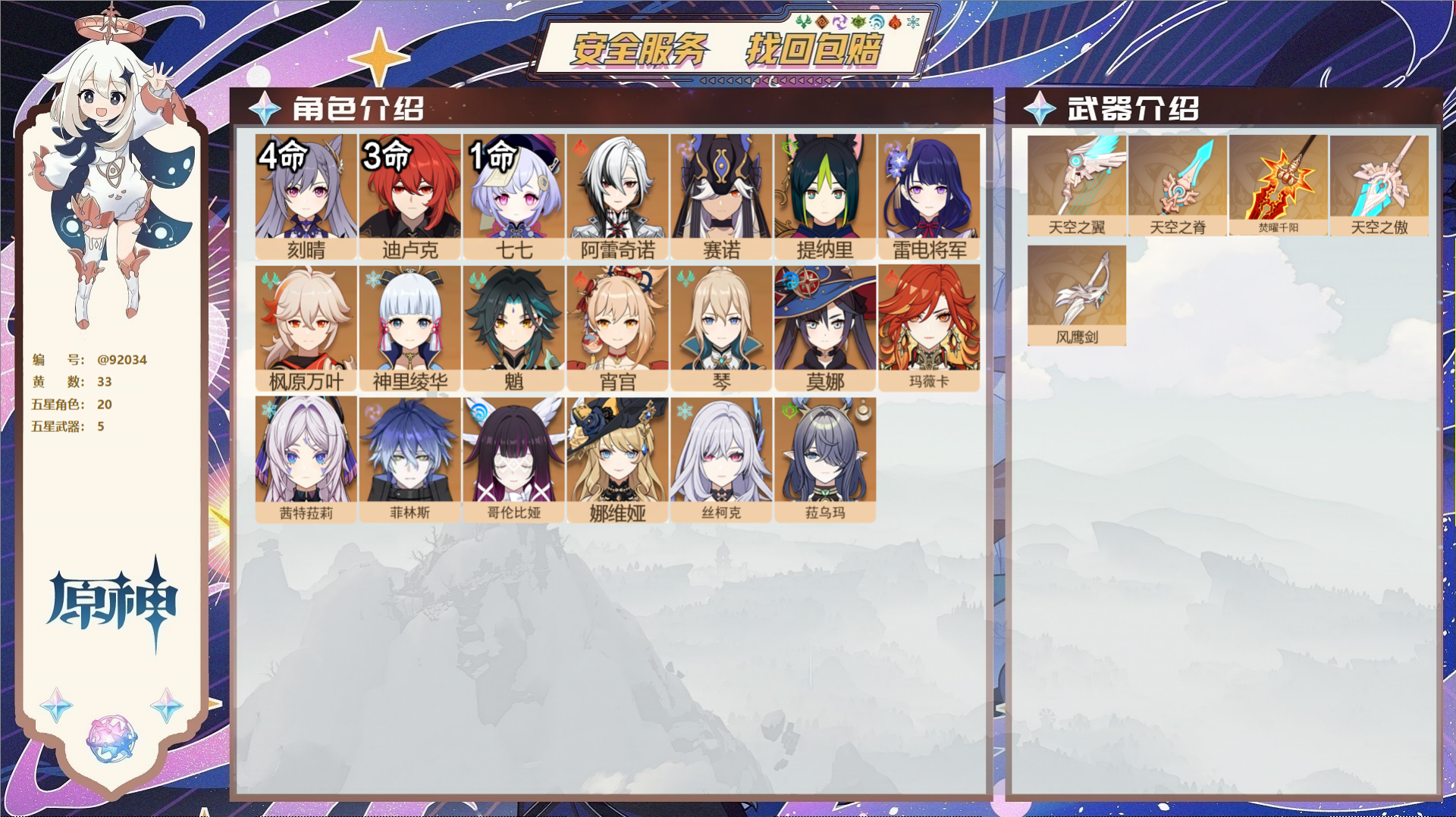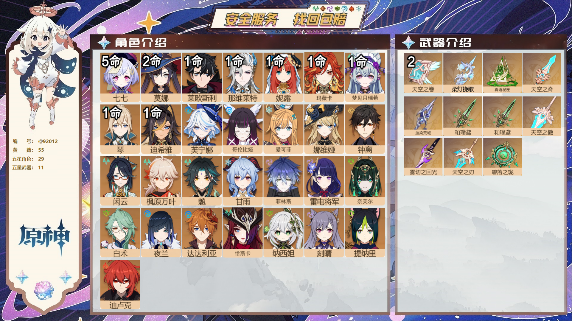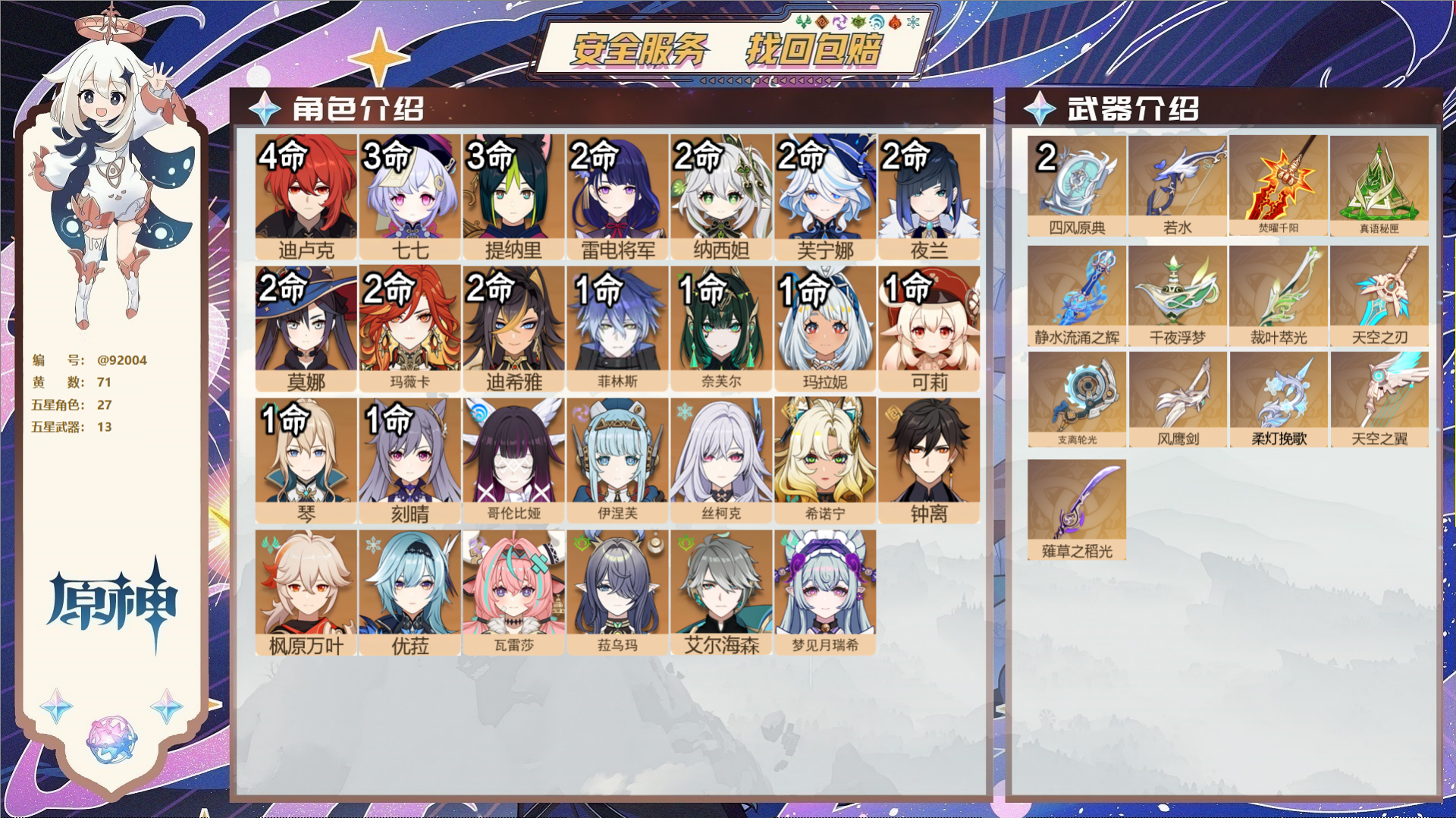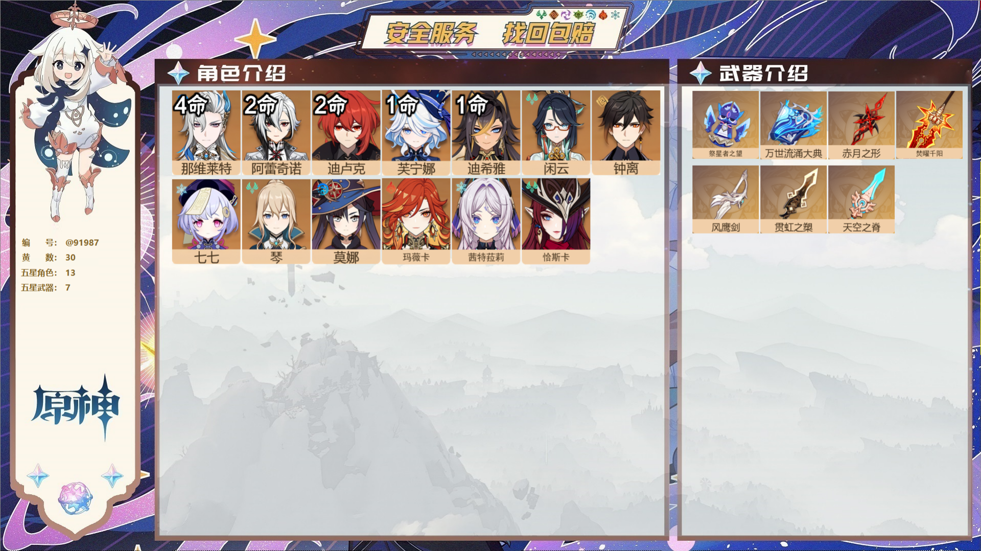 PX_2530493-,送未实名邮箱,,冒险等级55级,女主,30黄,13个五星角色,7个五星武器,纠缠之源0--原石410--圣遗物493, 【13个五星角色】,4命那维莱特,2命阿蕾奇诺,2命迪卢克,1命芙宁娜,1命迪希雅,0命闲云,0命钟离,0命七七,0命琴,0命莫娜,0命玛薇卡,0命茜特菈莉,0命恰斯卡, 【7个五星武器】,精1祭星者之望,精1万世流涌大典,精1赤月之形,精1焚曜千阳,精1风鹰剑,精1贯虹之槊,精1天空之脊,四星角色:5命班尼特,