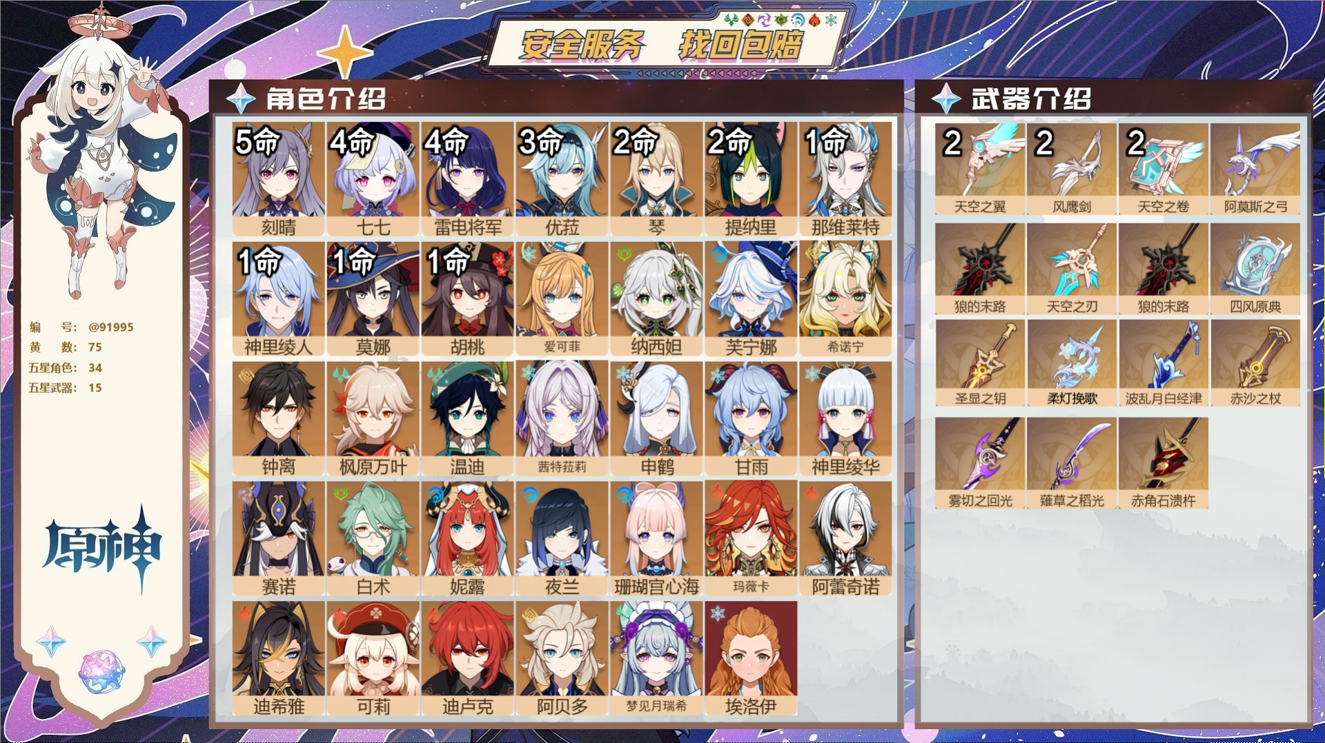 PX_2530527-,未绑定邮箱,,冒险等级60级,女主,75黄,34个五星角色,15个五星武器,纠缠之源1--原石470--圣遗物1877--【时装】,极夜真梦,岁夜欢哗,帆影游风,炽绘奇旅,纱中幽兰,叶隐芳名,闪耀协奏,倩影游侠,雨化竹身, 【34个五星角色】,5命刻晴,4命七七,4命雷电将军,3命优菈,2命琴,2命提纳里,1命那维莱特,1命神里绫人,1命莫娜,1命胡桃,0命爱可菲,0命纳西妲,0命芙宁娜,0命希诺宁,0命钟离,0命枫原万叶,0命温迪,0命茜特菈莉,0命申鹤,0命甘雨,0命神里绫华,0命赛诺,0命白术,0命妮露,0命夜兰,0命珊瑚宫心海,0命玛薇卡,0命阿蕾奇诺,0命迪希雅,0命可莉,0命迪卢克,0命阿贝多,0命梦见月瑞希,0命埃洛伊, 【15个五星武器】,精2天空之翼,精2风鹰剑,精2天空之卷,精1阿莫斯之弓,精1狼的末路,精1天空之刃,精1狼的末路,精1四风原典,精1圣显之钥,精1柔灯挽歌,精1波乱月白经津,精1赤沙之杖,精1雾切之回光,精1薙草之稻光,精1赤角石溃杵,9套, 【时装】,极夜真梦,岁夜欢哗,帆影游风,炽绘奇旅,纱中幽兰,叶隐芳名,闪耀协奏,倩影游侠,雨化竹身,
