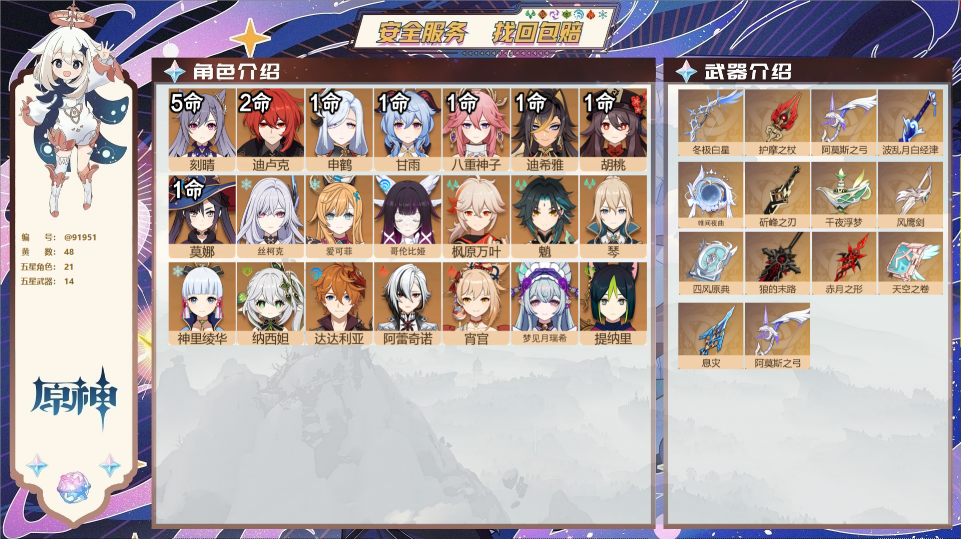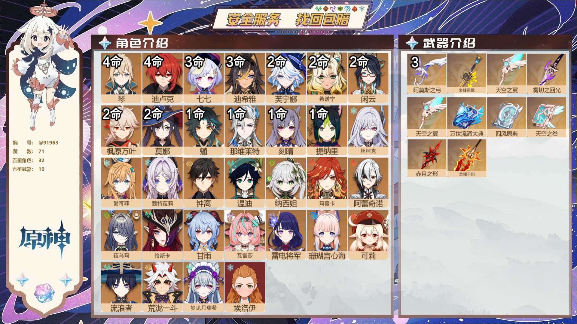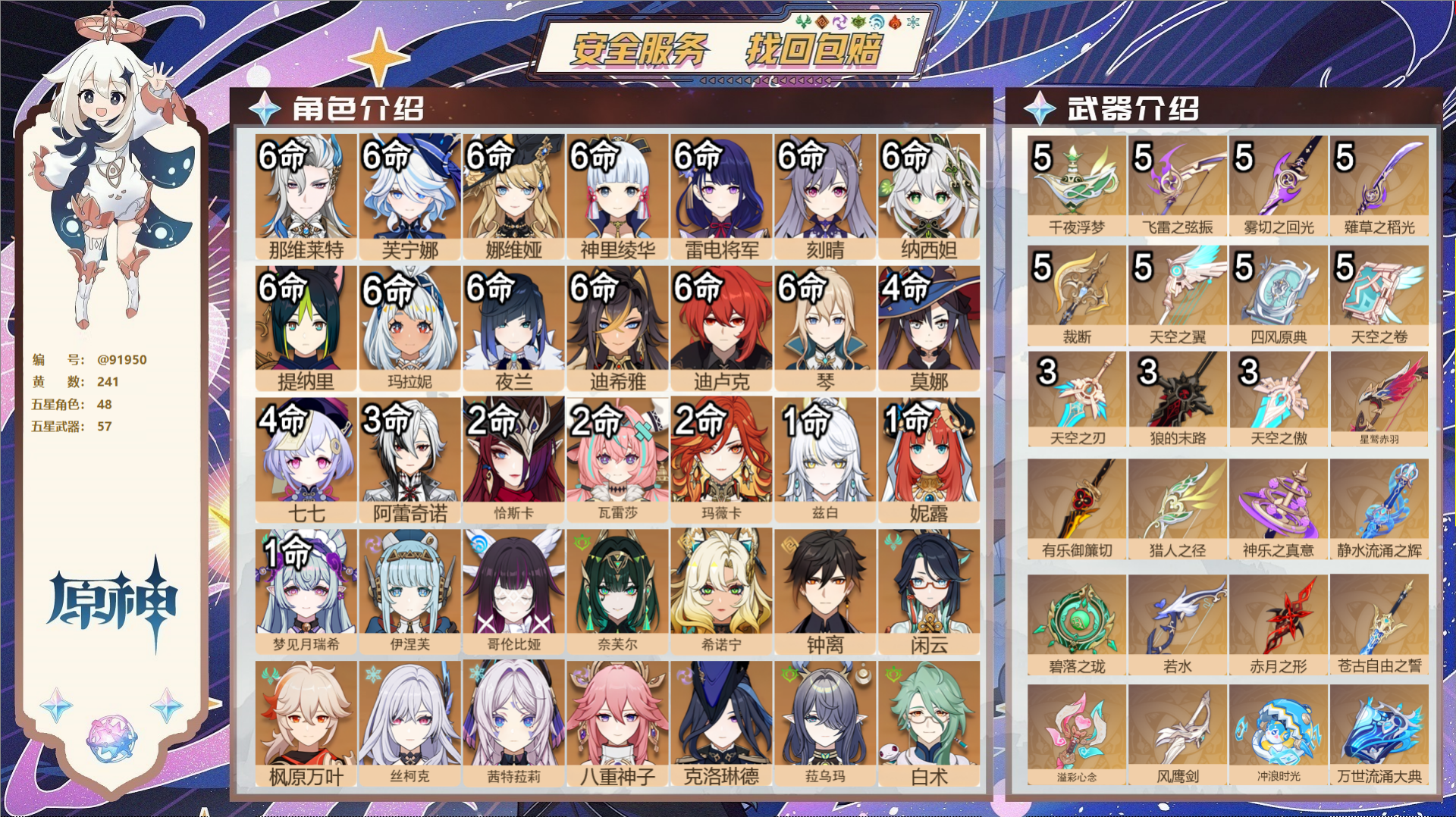 PX_2530493-,送未实名邮箱,,冒险等级55级,女主,30黄,13个五星角色,7个五星武器,纠缠之源0--原石410--圣遗物493, 【13个五星角色】,4命那维莱特,2命阿蕾奇诺,2命迪卢克,1命芙宁娜,1命迪希雅,0命闲云,0命钟离,0命七七,0命琴,0命莫娜,0命玛薇卡,0命茜特菈莉,0命恰斯卡, 【7个五星武器】,精1祭星者之望,精1万世流涌大典,精1赤月之形,精1焚曜千阳,精1风鹰剑,精1贯虹之槊,精1天空之脊,四星角色:5命班尼特,