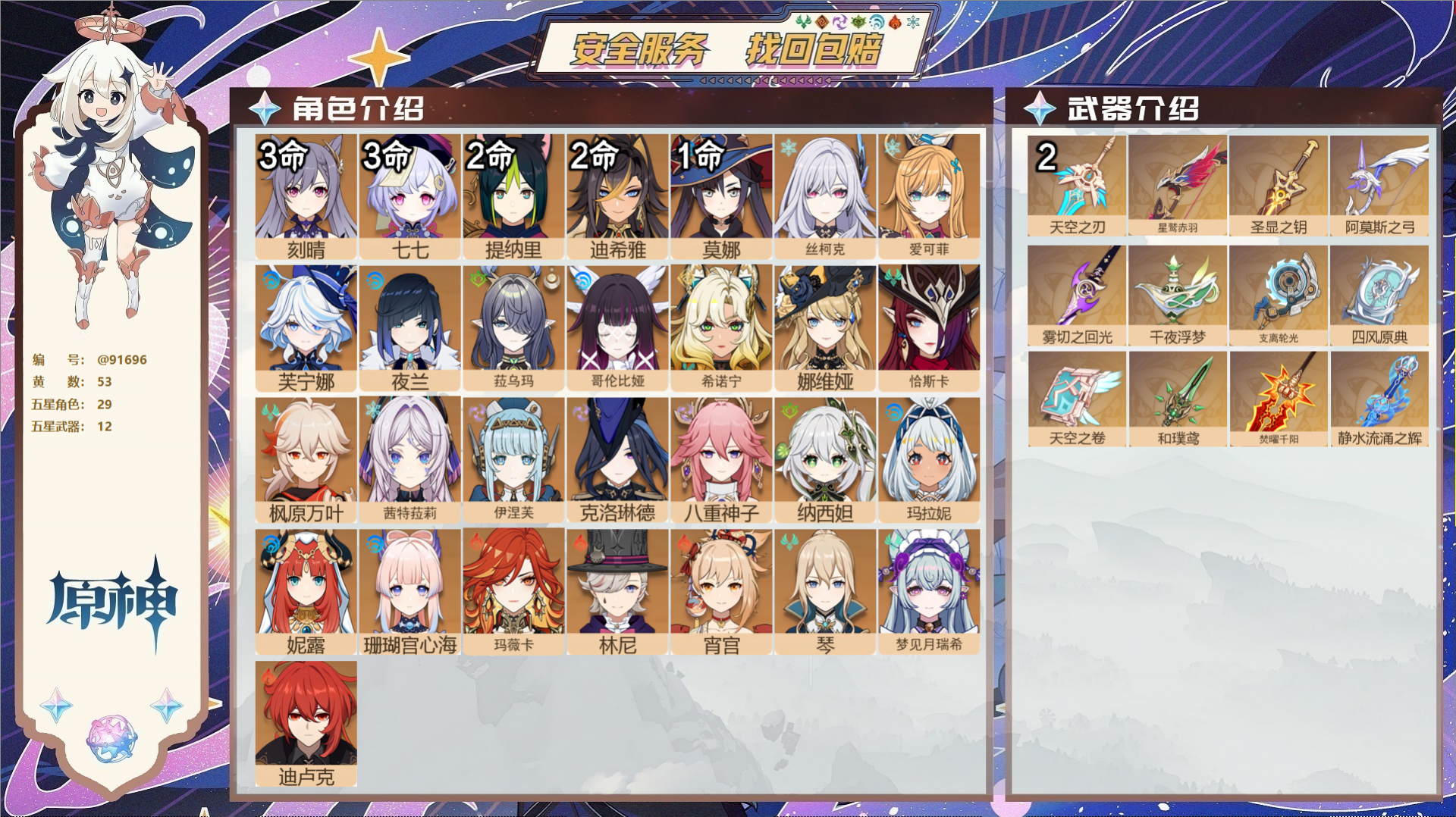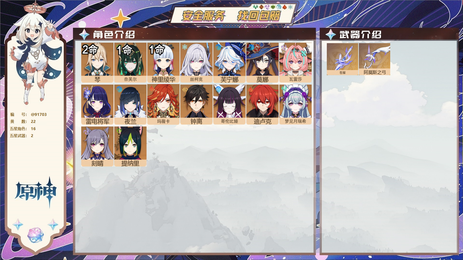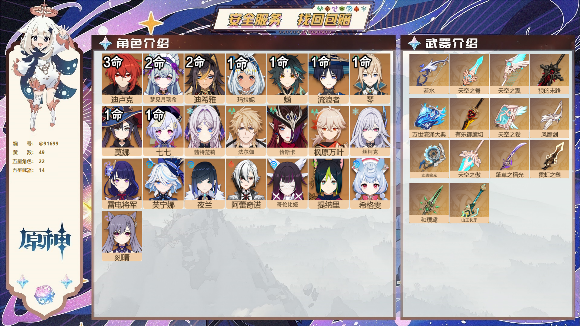 PX_2519783-,邮箱不出售,,冒险等级60级,女主,89黄,35个五星角色,33个五星武器,纠缠之源0--原石1469--圣遗物1350--【时装】,炽绘奇旅,莘露的赠礼,聆雨听竹,极夜真梦,霓裾翩跹,帆影游风,雨化竹身,叶隐芳名, 【35个五星角色】,满命莫娜,3命刻晴,3命提纳里,3命七七,2命迪卢克,1命夜兰,1命琴,1命迪希雅,0命哥伦比娅,0命伊涅芙,0命枫原万叶,0命兹白,0命丝柯克,0命达达利亚,0命闲云,0命荒泷一斗,0命钟离,0命恰斯卡,0命流浪者,0命魈,0命莱欧斯利,0命申鹤,0命神里绫华,0命克洛琳德,0命八重神子,0命雷电将军,0命基尼奇,0命纳西妲,0命芙宁娜,0命那维莱特,0命妮露,0命神里绫人,0命珊瑚宫心海,0命宵宫,0命梦见月瑞希, 【33个五星武器】,精2图莱杜拉的回忆,精1猎人之径,精1薙草之稻光,精1飞雷之弦振,精1千夜浮梦,精1息灾,精1飞雷之弦振,精1千夜浮梦,精1和璞鸢,精1若水,精1神乐之真意,精1天空之脊,精1帷间夜曲,精1四风原典,精1护摩之杖,精1冲浪时光,精1天空之卷,精1赤角石溃杵,精1金流监督,精1支离轮光,精1无工之剑,精1苍耀,精1天空之翼,精1狼的末路,精1赦罪,精1圣显之钥,精1阿莫斯之弓,精1雾切之回光,精1息灾,精1磐岩结绿,精1天空之刃,精1苍古自由之誓,精1天空之刃,8套, 【时装】,炽绘奇旅,莘露的赠礼,聆雨听竹,极夜真梦,霓裾翩跹,帆影游风,雨化竹身,叶隐芳名,