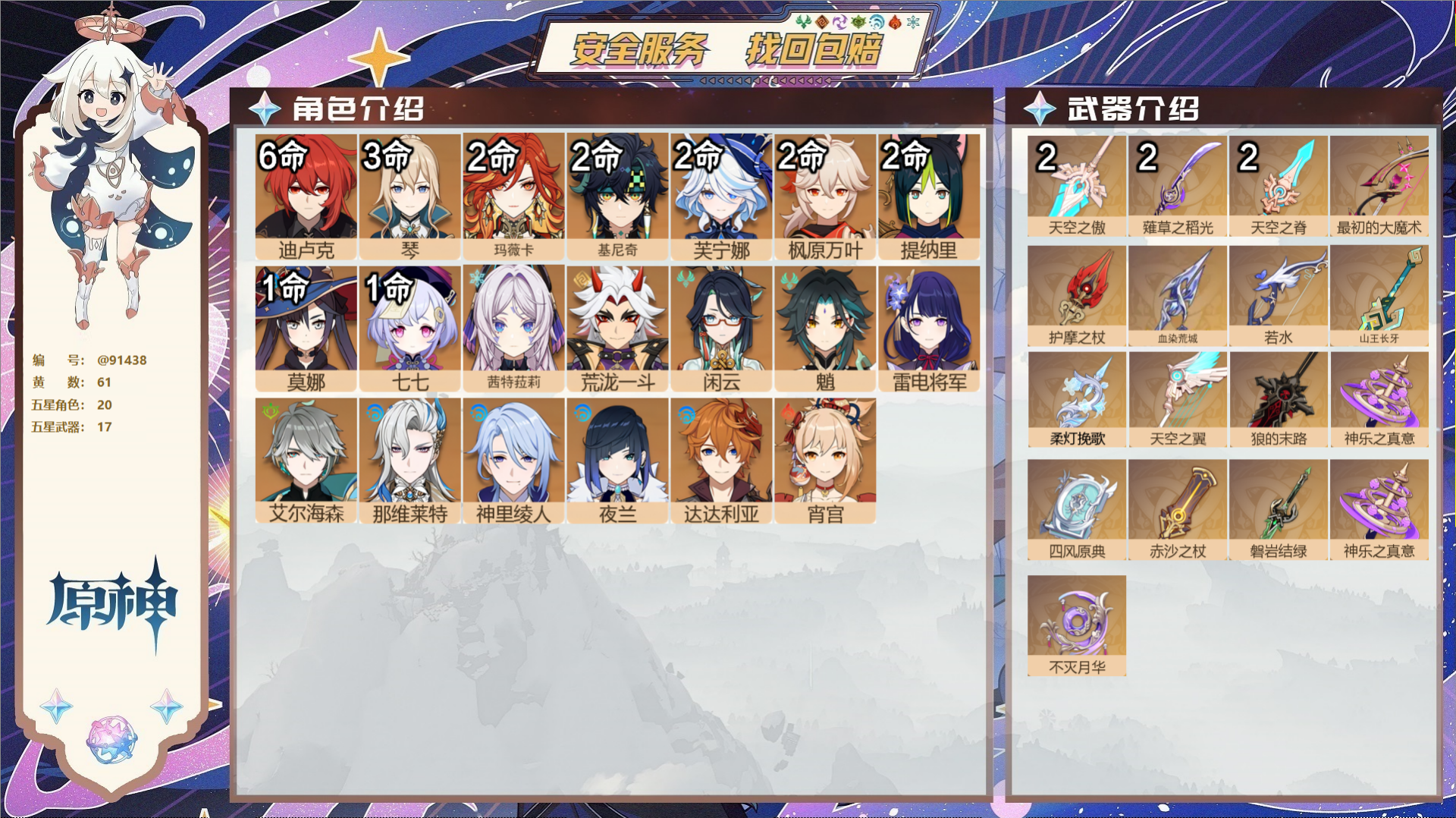 PX_2508987-,未绑定邮箱,,冒险等级60级,女主,61黄,20个五星角色,17个五星武器,纠缠之源0--原石27--圣遗物695--【时装】,纱中幽兰,叶隐芳名,极夜真梦,海风之梦,帆影游风,雨化竹身,倩影游侠,殷红终夜,岁夜欢哗, 【20个五星角色】,满命迪卢克,3命琴,2命玛薇卡,2命基尼奇,2命芙宁娜,2命枫原万叶,2命提纳里,1命莫娜,1命七七,0命茜特菈莉,0命荒泷一斗,0命闲云,0命魈,0命雷电将军,0命艾尔海森,0命那维莱特,0命神里绫人,0命夜兰,0命达达利亚,0命宵宫, 【17个五星武器】,精2天空之傲,精2薙草之稻光,精2天空之脊,精1最初的大魔术,精1护摩之杖,精1血染荒城,精1若水,精1山王长牙,精1柔灯挽歌,精1天空之翼,精1狼的末路,精1神乐之真意,精1四风原典,精1赤沙之杖,精1磐岩结绿,精1神乐之真意,精1不灭月华,9套, 【时装】,纱中幽兰,叶隐芳名,极夜真梦,海风之梦,帆影游风,雨化竹身,倩影游侠,殷红终夜,岁夜欢哗,