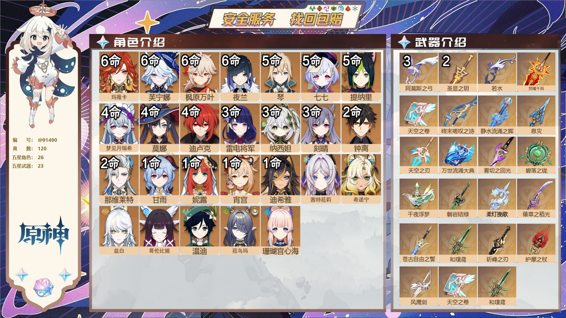PX_2508982-,未绑定邮箱,,冒险等级60级,男主,120黄,26个五星角色,23个五星武器,纠缠之源0--原石2422--圣遗物843--【时装】,玲雨听竹,炽绘奇旅,雨化竹身,倩影游侠,帆影游风,极夜真梦,叶隐芳名, 【26个五星角色】,满命玛薇卡,满命芙宁娜,满命枫原万叶,满命夜兰,5命琴,5命七七,5命提纳里,4命梦见月瑞希,4命莫娜,4命迪卢克,3命雷电将军,3命纳西妲,3命刻晴,2命钟离,2命那维莱特,1命甘雨,1命妮露,1命宵宫,1命迪希雅,0命茜特菈莉,0命希诺宁,0命兹白,0命哥伦比娅,0命温迪,0命菈乌玛,0命珊瑚宫心海, 【23个五星武器】,精3阿莫斯之弓,精2圣显之钥,精1若水,精1焚曜千阳,精1天空之卷,精1终末嗟叹之诗,精1静水流涌之辉,精1息灾,精1天空之刃,精1万世流涌大典,精1雾切之回光,精1碧落之珑,精1千夜浮梦,精1磐岩结绿,精1柔灯挽歌,精1薙草之稻光,精1苍古自由之誓,精1和璞鸢,精1斫峰之刃,精1护摩之杖,精1风鹰剑,精1天空之卷,精1和璞鸢,7套, 【时装】,玲雨听竹,炽绘奇旅,雨化竹身,倩影游侠,帆影游风,极夜真梦,叶隐芳名,