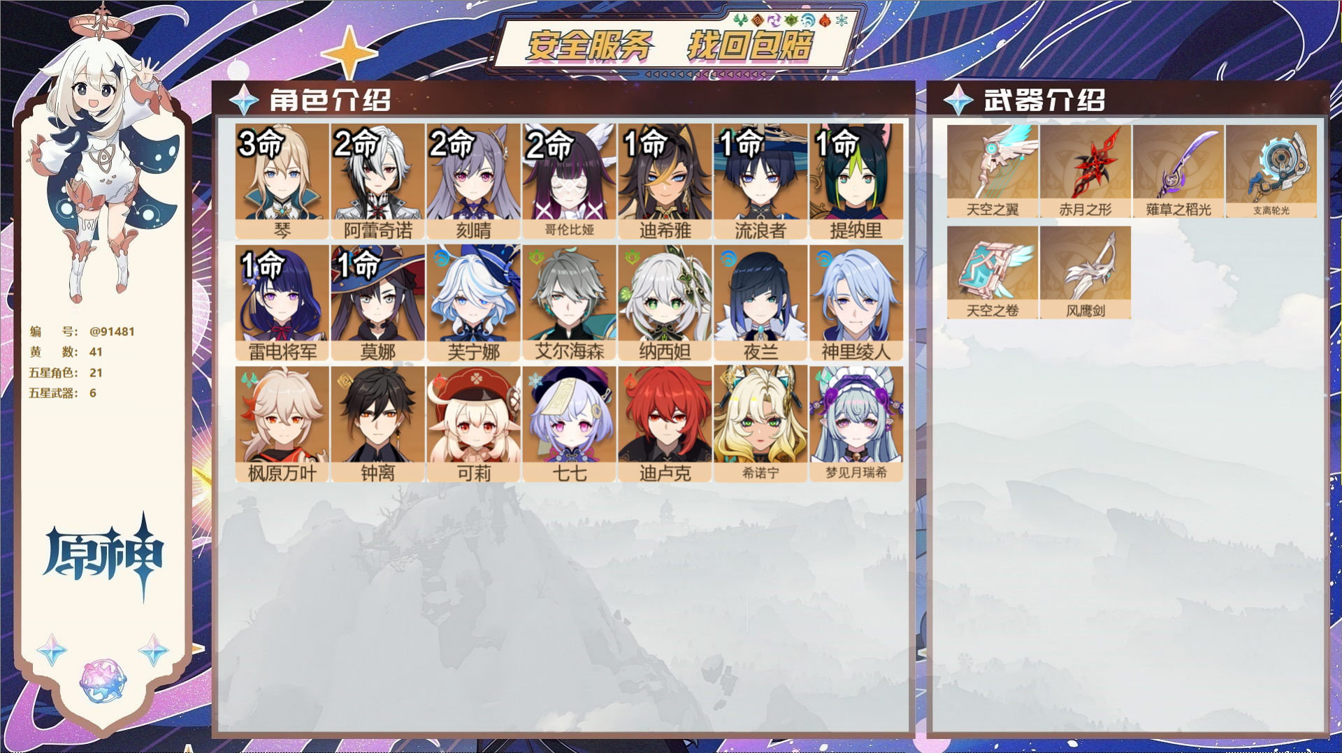 PX_2511264-,邮箱不出售,,冒险等级60级,女主,131黄,46个五星角色,31个五星武器,纠缠之源3--原石317--圣遗物412--【时装】,叶隐芳名,花时来信,宿雪桃红,炽绘奇旅,玲雨听竹,雨化竹身,帆影游风,冷花幽露,倩影游侠,岁夜欢哗, 【46个五星角色】,满命芙宁娜,满命琴,满命七七,5命刻晴,4命莫娜,3命雷电将军,3命提纳里,3命迪希雅,2命申鹤,2命纳西妲,2命梦见月瑞希,2命迪卢克,1命那维莱特,1命神里绫华,1命夜兰,1命阿蕾奇诺,1命胡桃,0命钟离,0命伊涅芙,0命恰斯卡,0命希格雯,0命丝柯克,0命兹白,0命希诺宁,0命千织,0命娜维娅,0命闲云,0命流浪者,0命枫原万叶,0命魈,0命爱可菲,0命茜特菈莉,0命优菈,0命甘雨,0命克洛琳德,0命赛诺,0命八重神子,0命奈芙尔,0命菈乌玛,0命哥伦比娅,0命妮露,0命珊瑚宫心海,0命达达利亚,0命玛薇卡,0命宵宫,0命可莉, 【31个五星武器】,精2最初的大魔术,精2和璞鸢,精2若水,精2天空之脊,精2阿莫斯之弓,精1千夜浮梦,精1猎人之径,精1千夜浮梦,精1和璞鸢,精1四风原典,精1天空之卷,精1护摩之杖,精1天空之翼,精1支离轮光,精1焚曜千阳,精1帷间夜曲,精1薙草之稻光,精1裁断,精1万世流涌大典,精1息灾,精1狼的末路,精1苍耀,精1风鹰剑,精1赦罪,精1天空之翼,精1有乐御簾切,精1天空之傲,精1静水流涌之辉,精1圣显之钥,精1波乱月白经津,精1雾切之回光,10套, 【时装】,叶隐芳名,花时来信,宿雪桃红,炽绘奇旅,玲雨听竹,雨化竹身,帆影游风,冷花幽露,倩影游侠,岁夜欢哗,