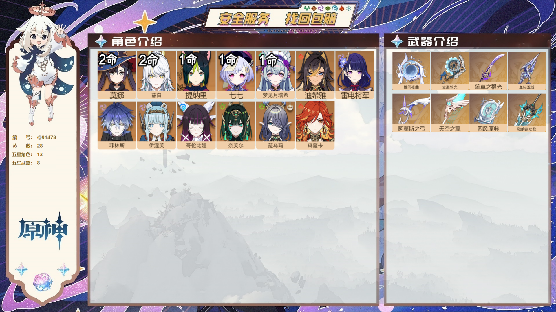 PX_2509037-,未绑定邮箱,,冒险等级60级,女主,72黄,25个五星角色,13个五星武器,纠缠之源0--原石3--圣遗物1222--【时装】,聆雨听竹,倩影游侠,雨化竹身,叶隐芳名,极夜真梦,纱中幽兰, 【25个五星角色】,满命妮露,满命八重神子,满命莫娜,3命神里绫华,3命七七,2命刻晴,2命迪卢克,1命胡桃,1命宵宫,1命哥伦比娅,1命艾梅莉埃,0命芙宁娜,0命迪希雅,0命艾尔海森,0命纳西妲,0命提纳里,0命荒泷一斗,0命优菈,0命雷电将军,0命枫原万叶,0命达达利亚,0命琴,0命菲林斯,0命梦见月瑞希,0命恰斯卡, 【13个五星武器】,精2和璞鸢,精2无工之剑,精1飞雷之弦振,精1神乐之真意,精1圣显之钥,精1雾切之回光,精1磐岩结绿,精1天空之刃,精1风鹰剑,精1万世流涌大典,精1千夜浮梦,精1天空之卷,精1波乱月白经津,四星角色:5命班尼特, 【时装】,聆雨听竹,倩影游侠,雨化竹身,叶隐芳名,极夜真梦,纱中幽兰,