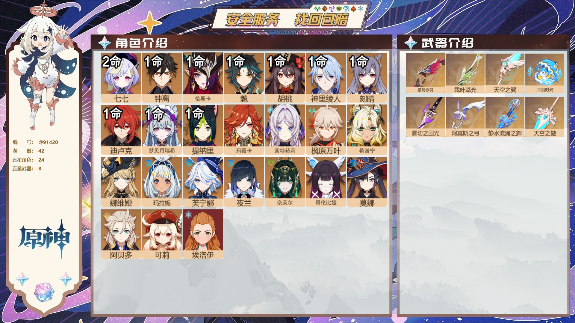 PX_2506834-,邮箱不出售,,冒险等级59级,男主,42黄,24个五星角色,8个五星武器,纠缠之源0--原石66--圣遗物381--【时装】,玲雨听竹,炽绘奇旅,闪耀协奏,纱中幽兰,叶隐芳名,极夜真梦,雨化竹身,倩影游侠, 【24个五星角色】,2命七七,1命钟离,1命恰斯卡,1命魈,1命胡桃,1命神里绫人,1命刻晴,1命迪卢克,1命梦见月瑞希,1命提纳里,0命玛薇卡,0命茜特菈莉,0命枫原万叶,0命希诺宁,0命娜维娅,0命玛拉妮,0命芙宁娜,0命夜兰,0命奈芙尔,0命哥伦比娅,0命莫娜,0命阿贝多,0命可莉,0命埃洛伊, 【8个五星武器】,精1星鹫赤羽,精1裁叶萃光,精1天空之翼,精1冲浪时光,精1雾切之回光,精1阿莫斯之弓,精1静水流涌之辉,精1天空之傲,8套, 【时装】,玲雨听竹,炽绘奇旅,闪耀协奏,纱中幽兰,叶隐芳名,极夜真梦,雨化竹身,倩影游侠,