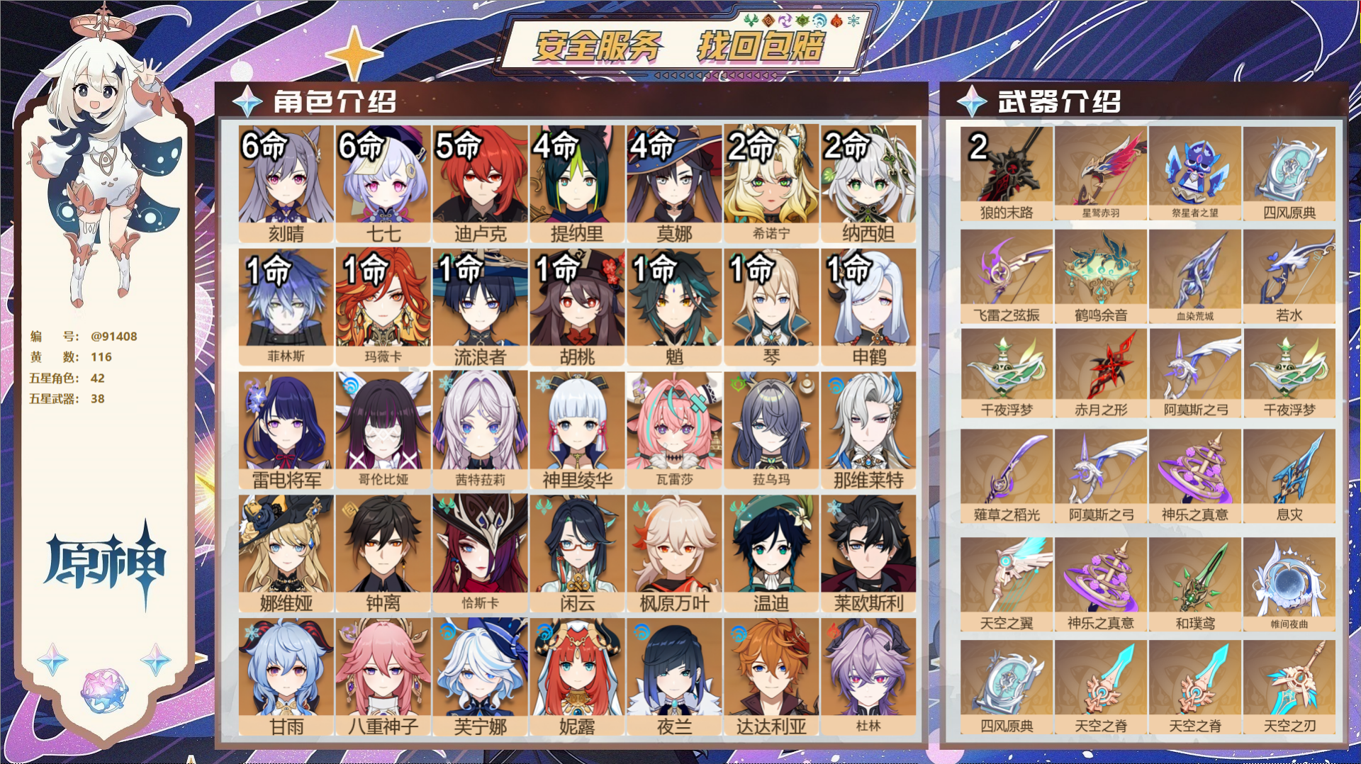 PX_2508960-,邮箱不出售,,冒险等级60级,男主,116黄,42个五星角色,38个五星武器,纠缠之源0--原石83--圣遗物553--【时装】,海风之梦,倩影游侠,岁夜欢哗,帆影游风,极夜真梦,叶隐芳名,闪耀协奏,雨化竹身,炽绘奇旅,玲雨听竹, 【42个五星角色】,满命刻晴,满命七七,5命迪卢克,4命提纳里,4命莫娜,2命希诺宁,2命纳西妲,1命菲林斯,1命玛薇卡,1命流浪者,1命胡桃,1命魈,1命琴,1命申鹤,0命雷电将军,0命哥伦比娅,0命茜特菈莉,0命神里绫华,0命瓦雷莎,0命菈乌玛,0命那维莱特,0命娜维娅,0命钟离,0命恰斯卡,0命闲云,0命枫原万叶,0命温迪,0命莱欧斯利,0命甘雨,0命八重神子,0命芙宁娜,0命妮露,0命夜兰,0命达达利亚,0命杜林,0命阿蕾奇诺,0命宵宫,0命可莉,0命白术,0命珊瑚宫心海,0命迪希雅,0命埃洛伊, 【38个五星武器】,精2狼的末路,精1星鹫赤羽,精1祭星者之望,精1四风原典,精1飞雷之弦振,精1鹤鸣余音,精1血染荒城,精1若水,精1千夜浮梦,精1赤月之形,精1阿莫斯之弓,精1千夜浮梦,精1薙草之稻光,精1阿莫斯之弓,精1神乐之真意,精1息灾,精1天空之翼,精1神乐之真意,精1和璞鸢,精1帷间夜曲,精1四风原典,精1天空之脊,精1天空之脊,精1天空之刃,精1天空之傲,精1护摩之杖,精1息灾,精1焚曜千阳,精1天空之脊,精1风鹰剑,精1裁断,精1裁断,精1岩峰巡歌,精1阿莫斯之弓,精1静水流涌之辉,精1支离轮光,精1雾切之回光,精1无工之剑,10套, 【时装】,海风之梦,倩影游侠,岁夜欢哗,帆影游风,极夜真梦,叶隐芳名,闪耀协奏,雨化竹身,炽绘奇旅,玲雨听竹,