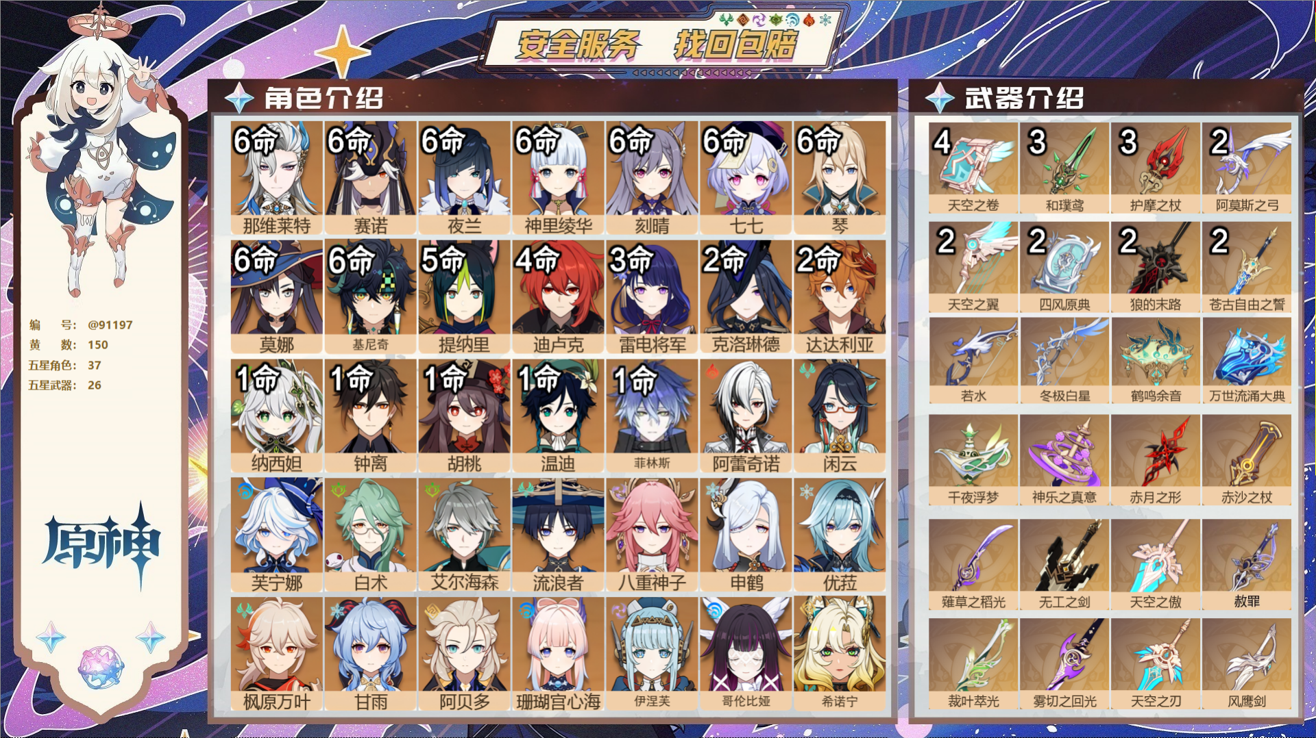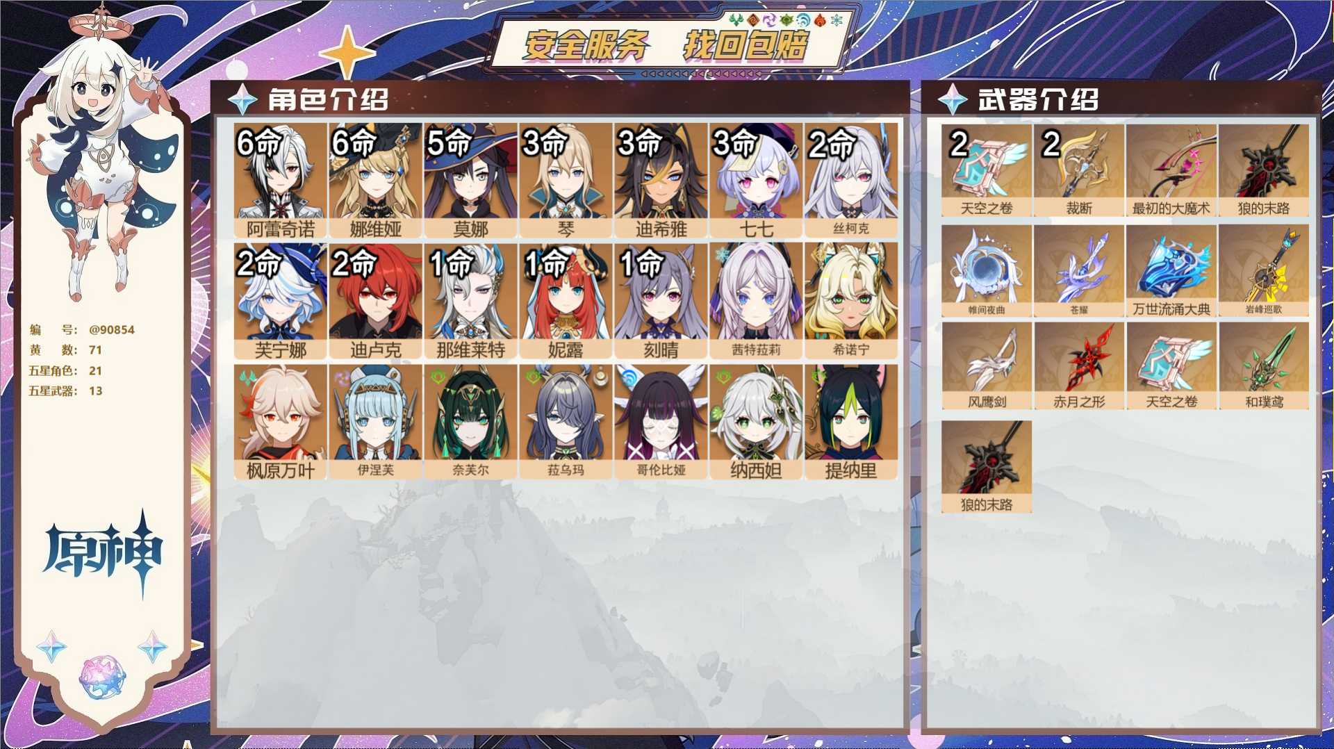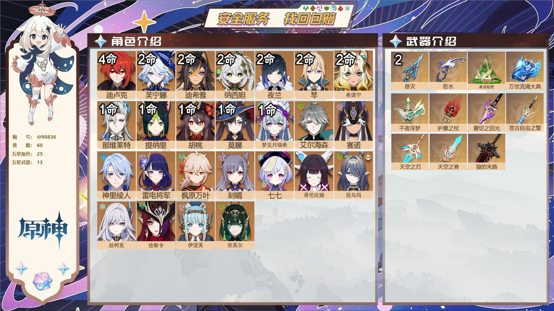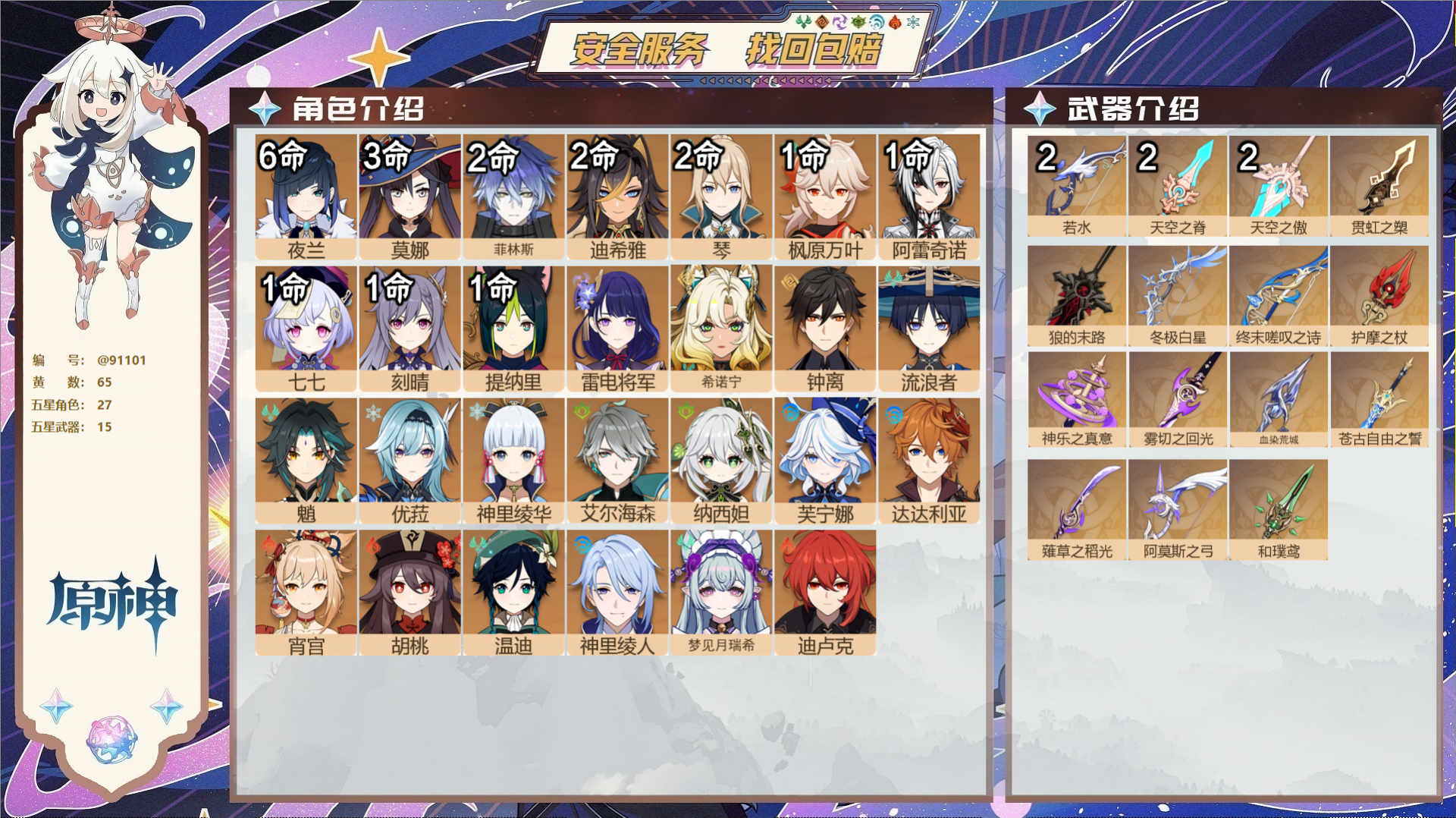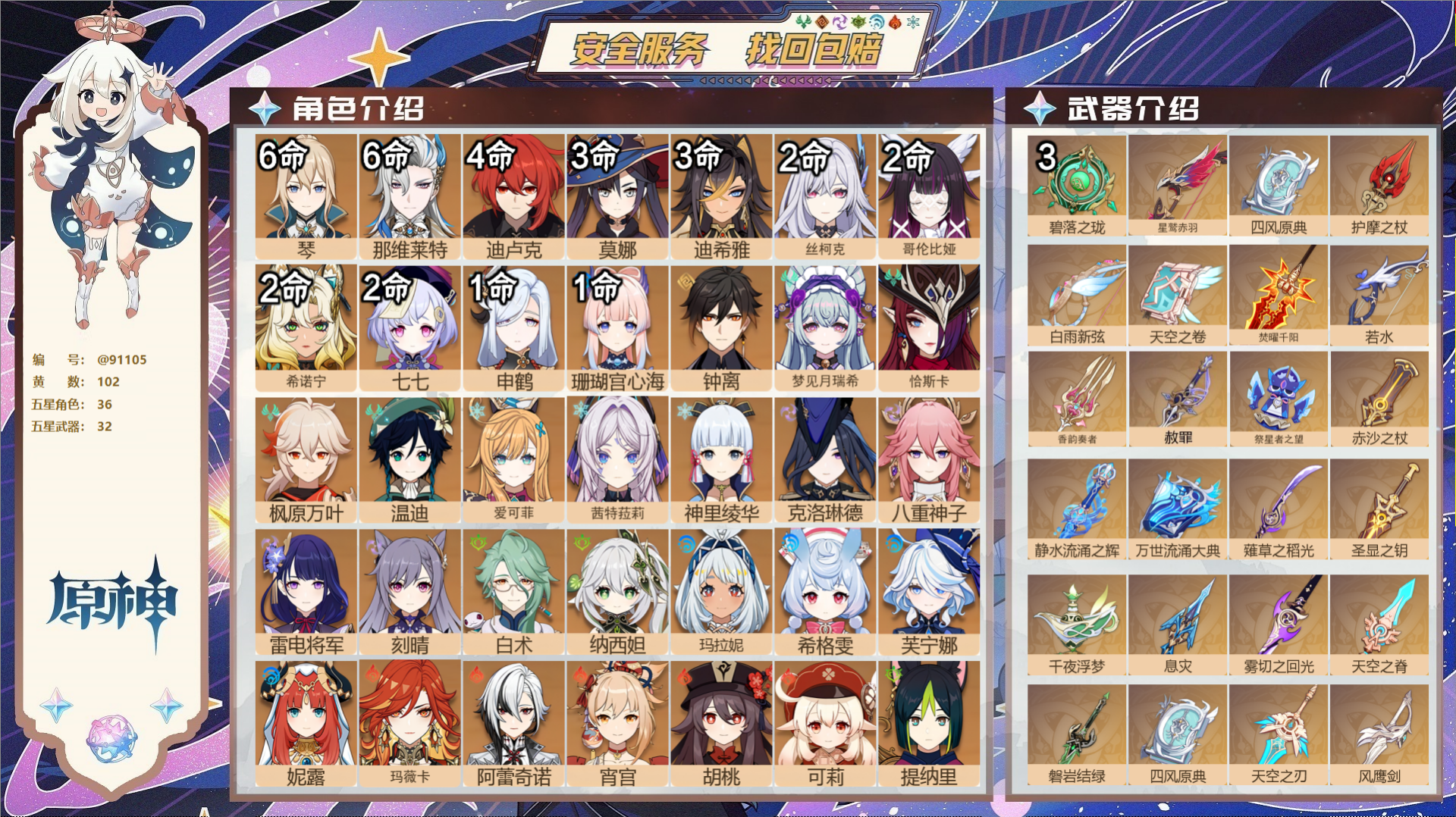 PX_2494075-,邮箱不出售,,冒险等级60级,女主,102黄,36个五星角色,32个五星武器,纠缠之源1--原石807--圣遗物486--【时装】,岁夜欢哗,雨化竹身,宿雪桃红,花时来信,帆影游风,叶隐芳名,莘露的赠礼,炽绘奇旅,倩影游侠,海风之梦, 【36个五星角色】,满命琴,满命那维莱特,4命迪卢克,3命莫娜,3命迪希雅,2命丝柯克,2命哥伦比娅,2命希诺宁,2命七七,1命申鹤,1命珊瑚宫心海,0命钟离,0命梦见月瑞希,0命恰斯卡,0命枫原万叶,0命温迪,0命爱可菲,0命茜特菈莉,0命神里绫华,0命克洛琳德,0命八重神子,0命雷电将军,0命刻晴,0命白术,0命纳西妲,0命玛拉妮,0命希格雯,0命芙宁娜,0命妮露,0命玛薇卡,0命阿蕾奇诺,0命宵宫,0命胡桃,0命可莉,0命提纳里,0命流浪者, 【32个五星武器】,精3碧落之珑,精1星鹫赤羽,精1四风原典,精1护摩之杖,精1白雨心弦,精1天空之卷,精1焚曜千阳,精1若水,精1香韵奏者,精1赦罪,精1祭星者之望,精1赤沙之杖,精1静水流涌之辉,精1万世流涌大典,精1薙草之稻光,精1圣显之钥,精1千夜浮梦,精1息灾,精1雾切之回光,精1天空之脊,精1磐岩结绿,精1四风原典,精1天空之刃,精1风鹰剑,精1天空之傲,精1冲浪时光,精1四风原典,精1狼的末路,精1狼的末路,精1帷间夜曲,精1山王长牙,精1阿莫斯之弓,10套, 【时装】,岁夜欢哗,雨化竹身,宿雪桃红,花时来信,帆影游风,叶隐芳名,莘露的赠礼,炽绘奇旅,倩影游侠,海风之梦,
