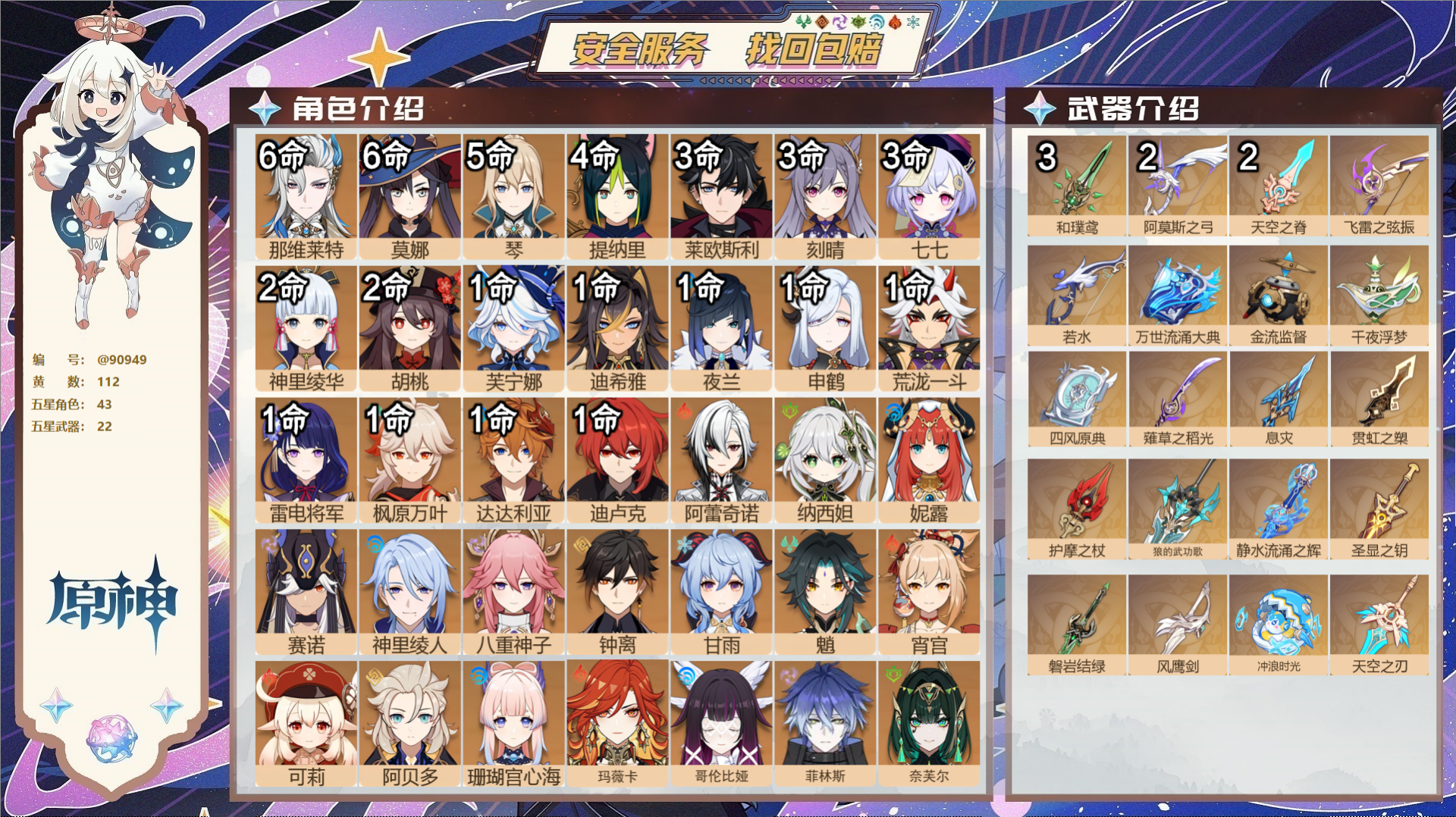 PX_2486137-,送已实名邮箱,,冒险等级60级,女主,112黄,43个五星角色,22个五星武器,纠缠之源0--原石90--圣遗物1929--【时装】,聆雨听竹,炽绘奇旅,倩影游侠,叶隐芳名,极夜真梦,纱中幽兰,闪耀协奏,殷红终夜,莘露的赠礼, 【43个五星角色】,满命那维莱特,满命莫娜,5命琴,4命提纳里,3命莱欧斯利,3命刻晴,3命七七,2命神里绫华,2命胡桃,1命芙宁娜,1命迪希雅,1命夜兰,1命申鹤,1命荒泷一斗,1命雷电将军,1命枫原万叶,1命达达利亚,1命迪卢克,0命阿蕾奇诺,0命纳西妲,0命妮露,0命赛诺,0命神里绫人,0命八重神子,0命钟离,0命甘雨,0命魈,0命宵宫,0命可莉,0命阿贝多,0命珊瑚宫心海,0命玛薇卡,0命哥伦比娅,0命菲林斯,0命奈芙尔,0命菈乌玛,0命艾梅莉埃,0命玛拉妮,0命希诺宁,0命爱可菲,0命基尼奇,0命娜维娅,0命伊涅芙, 【22个五星武器】,精3和璞鸢,精2阿莫斯之弓,精2天空之脊,精1飞雷之弦振,精1若水,精1万世流涌大典,精1金流监督,精1千夜浮梦,精1四风原典,精1薙草之稻光,精1息灾,精1贯虹之槊,精1护摩之杖,精1狼的武功歌,精1静水流涌之辉,精1圣显之钥,精1磐岩结绿,精1风鹰剑,精1冲浪时光,精1天空之刃, 【时装】,聆雨听竹,炽绘奇旅,倩影游侠,叶隐芳名,极夜真梦,纱中幽兰,闪耀协奏,殷红终夜,莘露的赠礼,