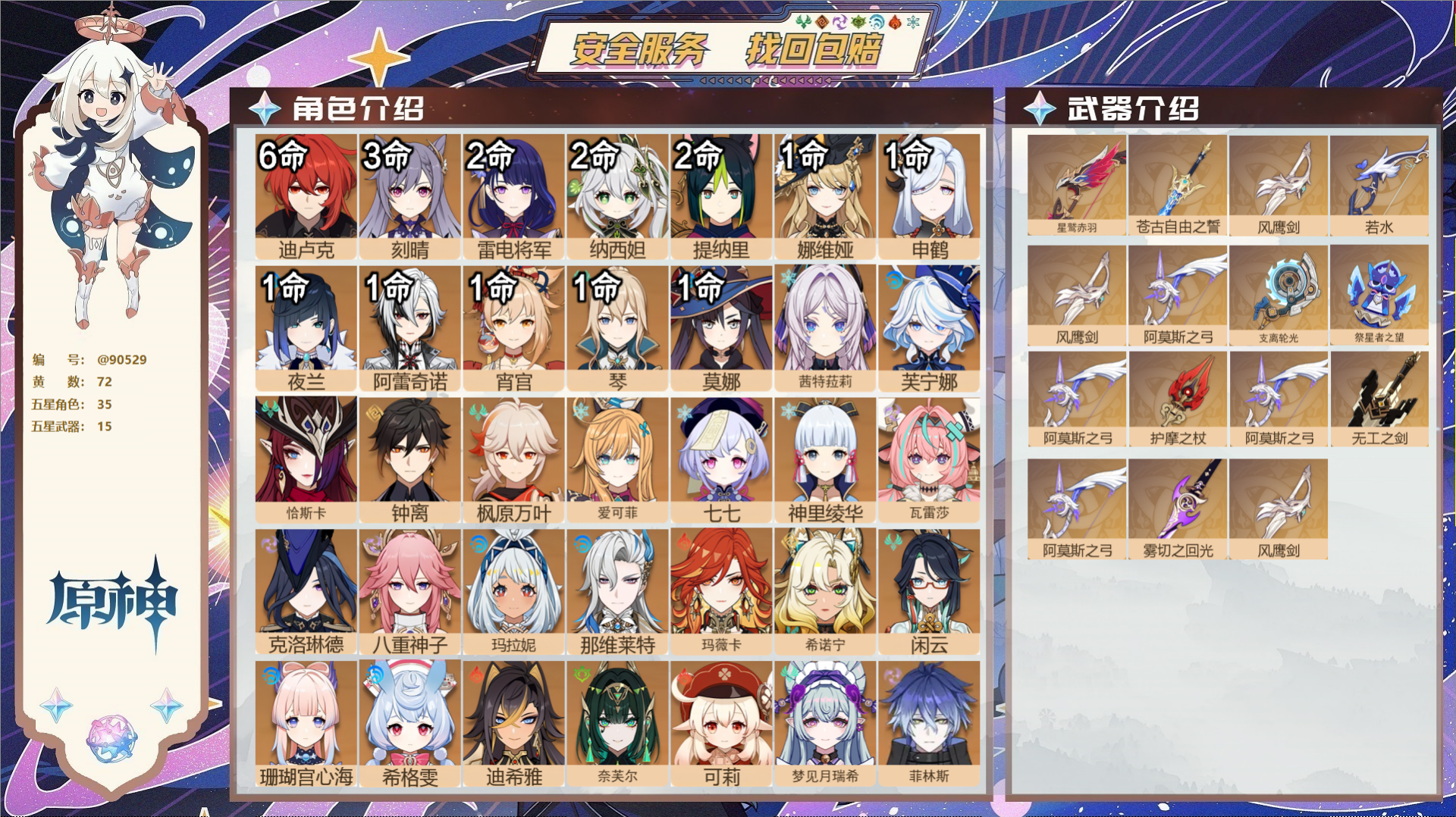PX_2473571-,邮箱不出售,,冒险等级60级,女主,72黄,35个五星角色,15个五星武器,纠缠之源0--原石109--圣遗物2254--【时装】,炽绘奇旅,倩影游侠,岁夜欢哗,帆影游风,雨化竹身,叶隐芳名,极夜真梦, 【35个五星角色】,满命迪卢克,3命刻晴,2命雷电将军,2命纳西妲,2命提纳里,1命娜维娅,1命申鹤,1命夜兰,1命阿蕾奇诺,1命宵宫,1命琴,1命莫娜,0命茜特菈莉,0命芙宁娜,0命恰斯卡,0命钟离,0命枫原万叶,0命爱可菲,0命七七,0命神里绫华,0命瓦雷莎,0命克洛琳德,0命八重神子,0命玛拉妮,0命那维莱特,0命玛薇卡,0命希诺宁,0命闲云,0命珊瑚宫心海,0命希格雯,0命迪希雅,0命奈芙尔,0命可莉,0命梦见月瑞希,0命菲林斯, 【15个五星武器】,精1星鹫赤羽,精1苍古自由之誓,精1风鹰剑,精1若水,精1风鹰剑,精1阿莫斯之弓,精1支离轮光,精1祭星者之望,精1阿莫斯之弓,精1护摩之杖,精1阿莫斯之弓,精1无工之剑,精1阿莫斯之弓,精1雾切之回光,精1风鹰剑,7套, 【时装】,炽绘奇旅,倩影游侠,岁夜欢哗,帆影游风,雨化竹身,叶隐芳名,极夜真梦,