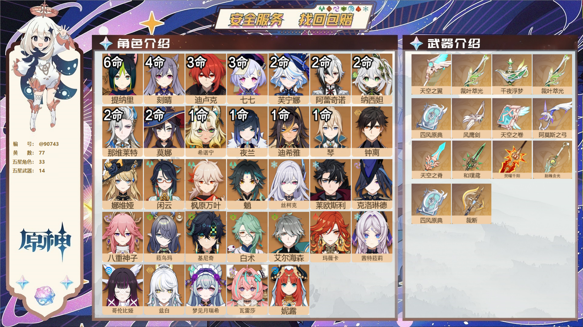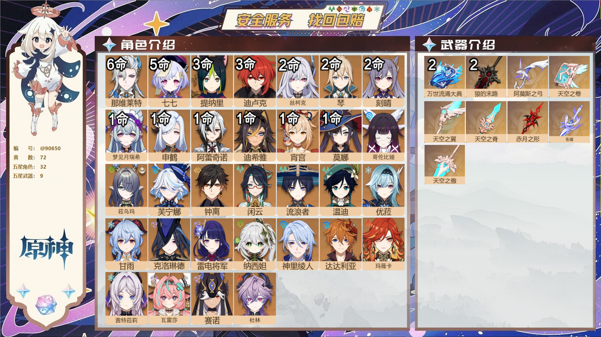 PX_2460145-,未绑定邮箱,,冒险等级60级,女主,73黄,28个五星角色,15个五星武器,纠缠之源0--原石99--圣遗物256--【时装】,炽绘奇旅,岁夜欢哗,倩影游侠,雨化竹身,帆影游风, 【28个五星角色】,满命夜兰,5命刻晴,4命迪希雅,3命七七,2命芙宁娜,2命那维莱特,2命莫娜,1命克洛琳德,1命钟离,1命胡桃,1命琴,1命迪卢克,0命阿蕾奇诺,0命纳西妲,0命提纳里,0命雷电将军,0命枫原万叶,0命宵宫,0命梦见月瑞希,0命希诺宁,0命爱可菲,0命菲林斯,0命伊涅芙,0命瓦雷莎,0命基尼奇,0命杜林,0命恰斯卡,0命玛薇卡, 【15个五星武器】,精2天空之卷,精1星鹫赤羽,精1白雨心弦,精1飞雷之弦振,精1若水,精1阿莫斯之弓,精1万世流涌大典,精1千夜浮梦,精1支离轮光,精1赤月之形,精1薙草之稻光,精1裁叶萃光,精1天空之刃,精1贯虹之槊, 【时装】,炽绘奇旅,岁夜欢哗,倩影游侠,雨化竹身,帆影游风,