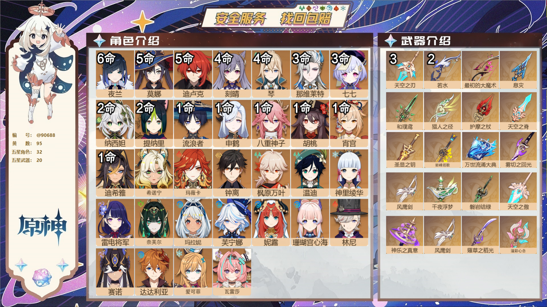 PX_2479380-,邮箱不出售,,冒险等级60级,女主,95黄,32个五星角色,20个五星武器,纠缠之源0--原石120--圣遗物946--【时装】,静暇雅宴,宿雪桃红,莘露的赠礼,纱中幽兰,叶隐芳名, 【32个五星角色】,满命夜兰,5命莫娜,5命迪卢克,4命刻晴,4命琴,3命那维莱特,3命七七,2命纳西妲,2命提纳里,1命流浪者,1命申鹤,1命八重神子,1命胡桃,1命宵宫,1命迪希雅,0命希诺宁,0命玛薇卡,0命钟离,0命枫原万叶,0命温迪,0命神里绫华,0命雷电将军,0命奈芙尔,0命玛拉妮,0命芙宁娜,0命妮露,0命珊瑚宫心海,0命林尼,0命赛诺,0命达达利亚,0命爱可菲,0命瓦雷莎, 【20个五星武器】,精3天空之刃,精2若水,精1最初的大魔术,精1息灾,精1和璞鸢,精1猎人之径,精1护摩之杖,精1天空之脊,精1圣显之钥,精1岩峰巡歌,精1万世流涌大典,精1雾切之回光,精1风鹰剑,精1千夜浮梦,精1磐岩结绿,精1天空之傲,精1神乐之真意,精1风鹰剑,精1薙草之稻光,精1溢彩心念,5套, 【时装】,静暇雅宴,宿雪桃红,莘露的赠礼,纱中幽兰,叶隐芳名,