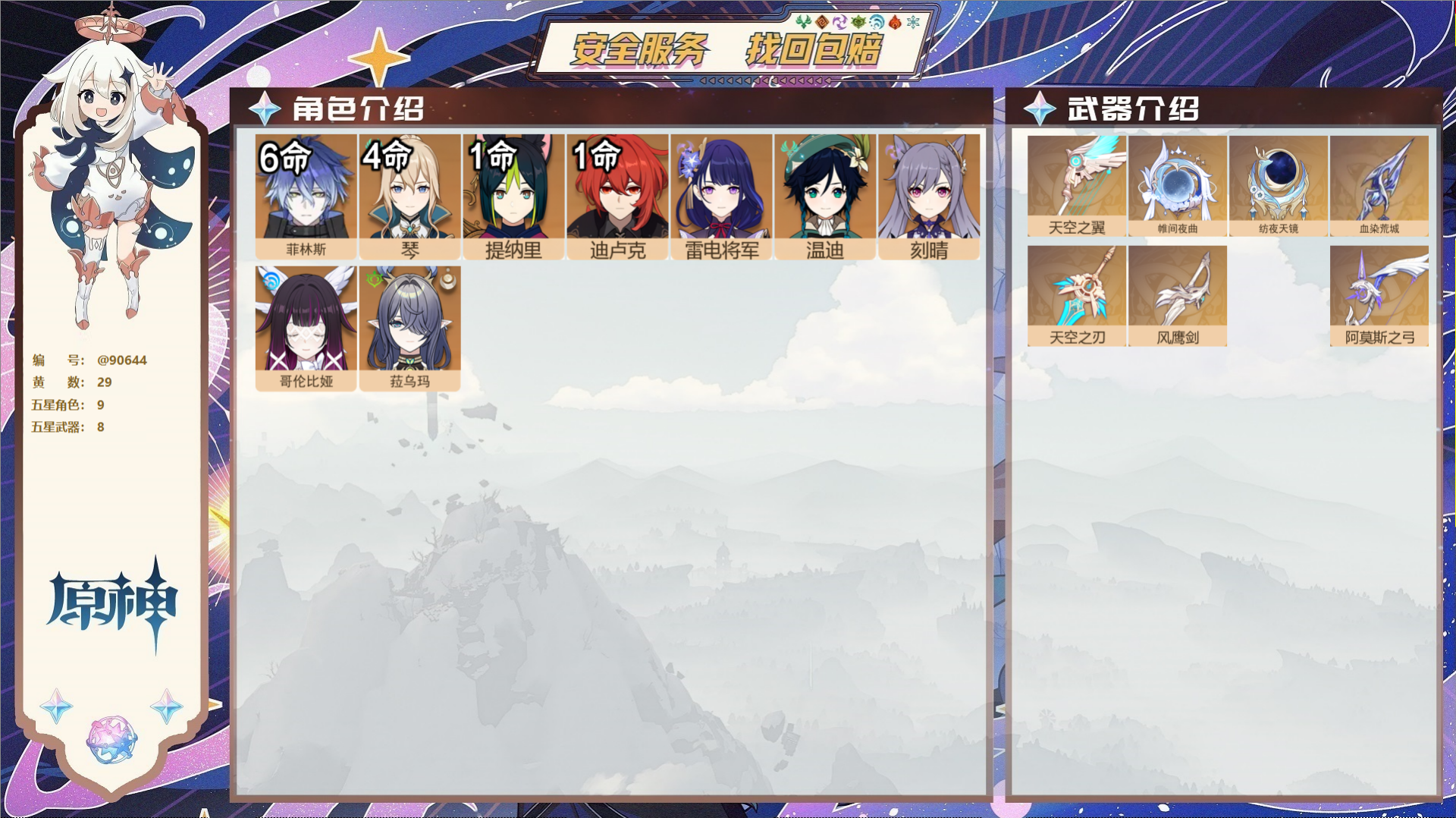 PX_2479352-,送已实名邮箱,,冒险等级57级,男主,29黄,9个五星角色,8个五星武器,纠缠之源0--原石140--圣遗物127--【时装】,聆雨听竹, 【9个五星角色】,满命菲林斯,4命琴,1命提纳里,1命迪卢克,0命雷电将军,0命温迪,0命刻晴,0命哥伦比娅,0命菈乌玛, 【8个五星武器】,精1天空之翼,精1帷间夜曲,精1纺夜天镜,精1血染荒城,精1天空之刃,精1风鹰剑,精1狼的武功歌,精1阿莫斯之弓, 【时装】,聆雨听竹,