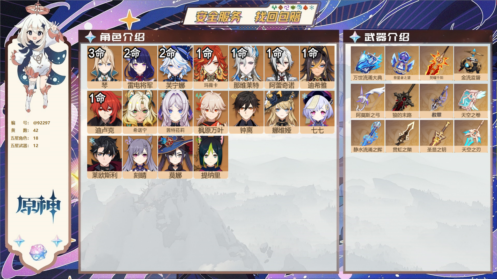PX_2544358-,邮箱不出售,,冒险等级59级,女主,42黄,18个五星角色,12个五星武器,纠缠之源0--原石9--圣遗物826--【时装】,雨化竹身,倩影游侠,岁夜欢哗, 【18个五星角色】,3命琴,2命雷电将军,2命芙宁娜,1命玛薇卡,1命那维莱特,1命阿蕾奇诺,1命迪希雅,1命迪卢克,0命希诺宁,0命茜特菈莉,0命枫原万叶,0命钟离,0命娜维娅,0命七七,0命莱欧斯利,0命刻晴,0命莫娜,0命提纳里, 【12个五星武器】,精1万世流涌大典,精1祭星者之望,精1焚曜千阳,精1金流监督,精1阿莫斯之弓,精1狼的末路,精1赦罪,精1天空之卷,精1静水流涌之辉,精1贯虹之槊,精1圣显之钥,精1天空之刃,3套, 【时装】,雨化竹身,倩影游侠,岁夜欢哗,