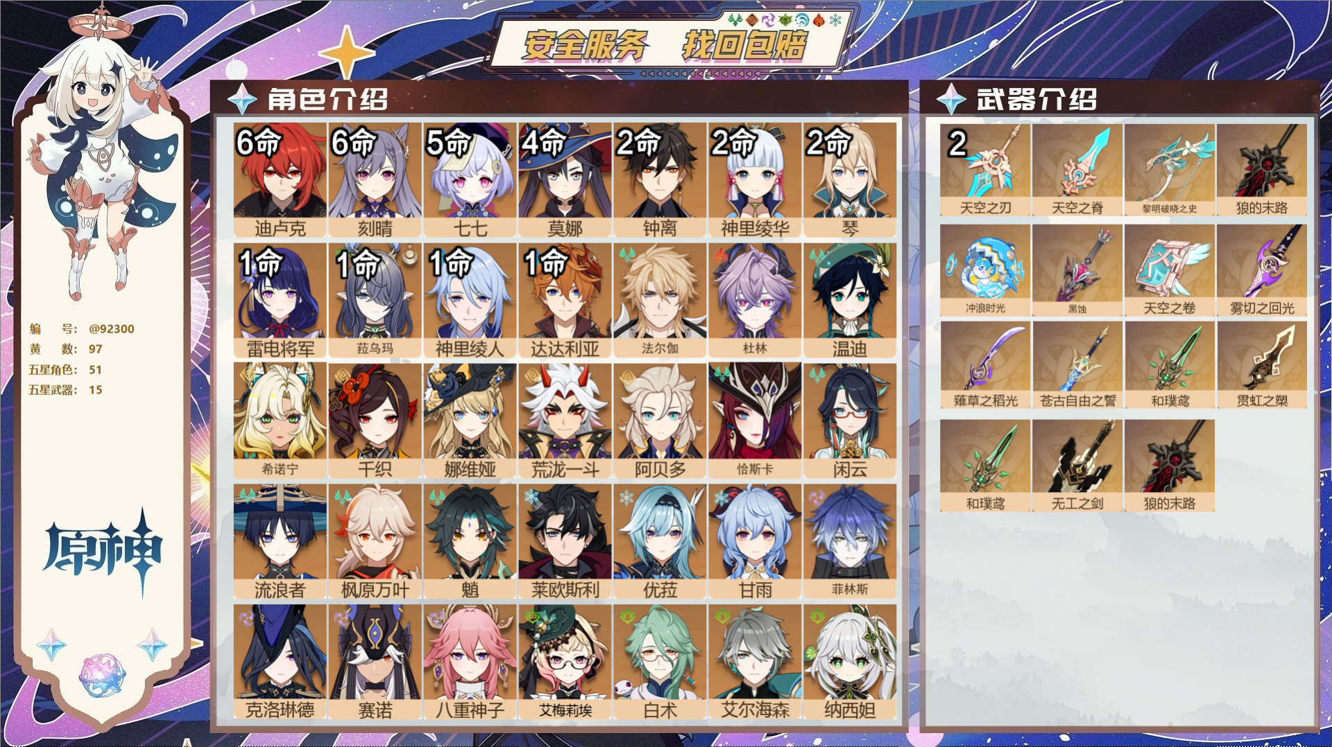 PX_2544369-,未绑定邮箱,送TAP,冒险等级60级,男主,97黄,51个五星角色,15个五星武器,纠缠之源0--原石208--圣遗物1871--【时装】,纱中幽兰,闪耀协奏,倩影游侠,殷红终夜,花时来信,极夜真梦,炽绘奇旅,帆影游风,聆雨听竹,岁夜欢哗,雨化竹身,叶隐芳名, 【51个五星角色】,满命迪卢克,满命刻晴,5命七七,4命莫娜,2命钟离,2命神里绫华,2命琴,1命雷电将军,1命菈乌玛,1命神里绫人,1命达达利亚,0命法尔伽,0命杜林,0命温迪,0命希诺宁,0命千织,0命娜维娅,0命荒泷一斗,0命阿贝多,0命恰斯卡,0命闲云,0命流浪者,0命枫原万叶,0命魈,0命莱欧斯利,0命优菈,0命甘雨,0命菲林斯,0命克洛琳德,0命赛诺,0命八重神子,0命艾梅莉埃,0命白术,0命艾尔海森,0命纳西妲,0命哥伦比娅,0命玛拉妮,0命芙宁娜,0命那维莱特,0命妮露,0命夜兰,0命珊瑚宫心海,0命玛薇卡,0命阿蕾奇诺,0命林尼,0命宵宫,0命可莉,0命迪希雅,0命梦见月瑞希,0命提纳里,0命埃洛伊, 【15个五星武器】,精2天空之刃,精1天空之脊,精1黎明破晓之史,精1狼的末路,精1冲浪时光,精1黑蚀,精1天空之卷,精1雾切之回光,精1薙草之稻光,精1苍古自由之誓,精1和璞鸢,精1贯虹之槊,精1和璞鸢,精1无工之剑,精1狼的末路,12套, 【时装】,纱中幽兰,闪耀协奏,倩影游侠,殷红终夜,花时来信,极夜真梦,炽绘奇旅,帆影游风,聆雨听竹,岁夜欢哗,雨化竹身,叶隐芳名,
