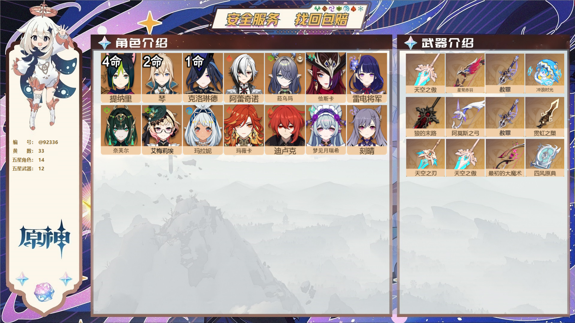 PX_2544492-,未绑定邮箱,,冒险等级58级,女主,29黄,20个五星角色,4个五星武器,纠缠之源0--原石60--圣遗物295--【时装】,倩影游侠,炽绘奇旅,岁夜欢哗,雨化竹身,帆影游风, 【20个五星角色】,2命提纳里,1命那维莱特,1命莫娜,0命魈,0命芙宁娜,0命钟离,0命枫原万叶,0命艾尔海森,0命阿蕾奇诺,0命娜维娅,0命恰斯卡,0命克洛琳德,0命神里绫人,0命八重神子,0命玛薇卡,0命茜特菈莉,0命琴,0命七七,0命梦见月瑞希,0命刻晴, 【4个五星武器】,精2天空之卷,精1冲浪时光,精1天空之刃,精1狼的末路,5套, 【时装】,倩影游侠,炽绘奇旅,岁夜欢哗,雨化竹身,帆影游风,