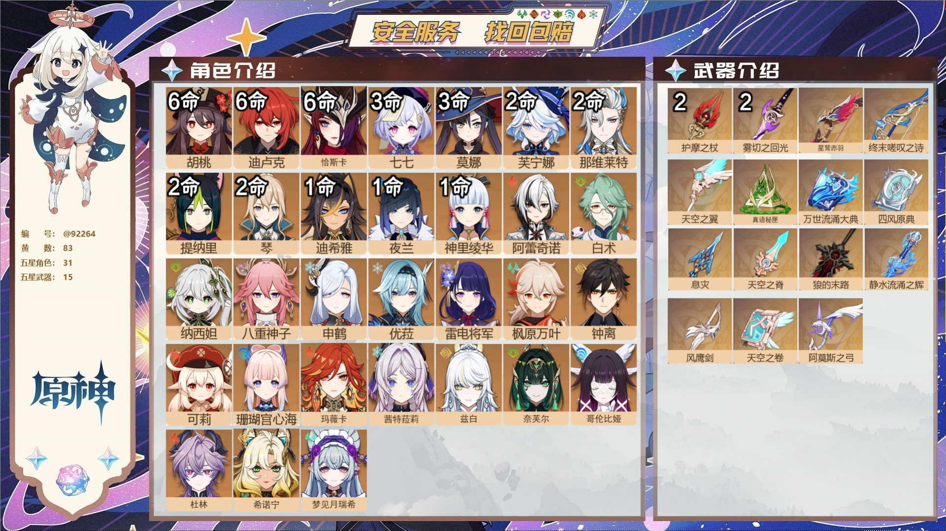 PX_2544355-,送已实名邮箱,,冒险等级60级,女主,83黄,31个五星角色,15个五星武器,纠缠之源0--原石2087--圣遗物1993--【时装】,聆雨听竹,炽绘奇旅,岁夜欢哗,倩影游侠,雨化竹身,帆影游风,叶隐芳名,极夜真梦,纱中幽兰,闪耀协奏,宿雪桃红, 【31个五星角色】,满命胡桃,满命迪卢克,满命恰斯卡,3命七七,3命莫娜,2命芙宁娜,2命那维莱特,2命提纳里,2命琴,1命迪希雅,1命夜兰,1命神里绫华,0命阿蕾奇诺,0命白术,0命纳西妲,0命八重神子,0命申鹤,0命优菈,0命雷电将军,0命枫原万叶,0命钟离,0命可莉,0命珊瑚宫心海,0命玛薇卡,0命茜特菈莉,0命兹白,0命奈芙尔,0命哥伦比娅,0命杜林,0命希诺宁,0命梦见月瑞希, 【15个五星武器】,精2护摩之杖,精2雾切之回光,精1星鹫赤羽,精1终末嗟叹之诗,精1天空之翼,精1真语秘匣,精1万世流涌大典,精1四风原典,精1息灾,精1天空之脊,精1狼的末路,精1静水流涌之辉,精1风鹰剑,精1天空之卷,精1阿莫斯之弓, 【时装】,聆雨听竹,炽绘奇旅,岁夜欢哗,倩影游侠,雨化竹身,帆影游风,叶隐芳名,极夜真梦,纱中幽兰,闪耀协奏,宿雪桃红,