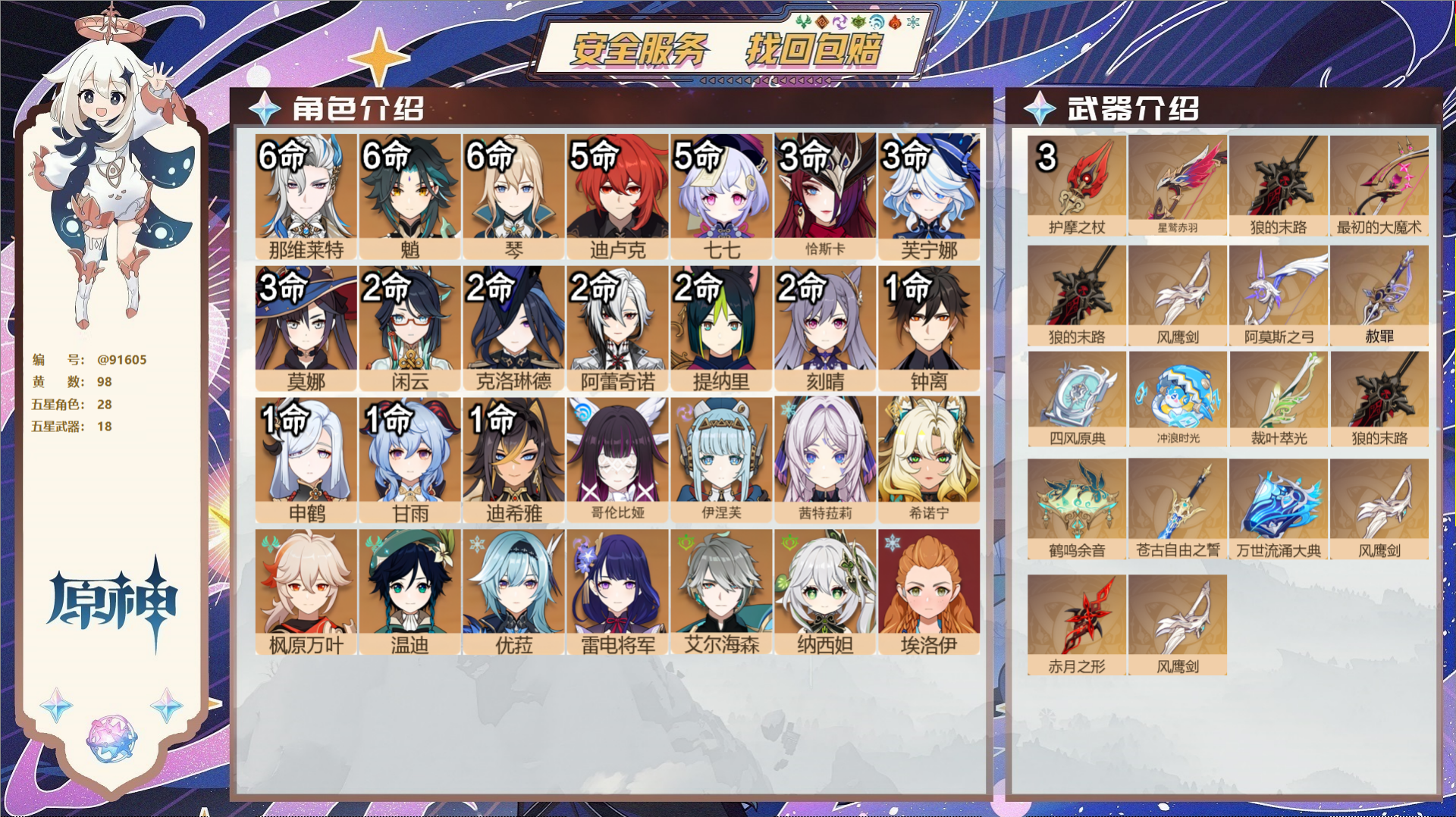 PX_2542981-,邮箱不出售,,冒险等级60级,男主,98黄,28个五星角色,18个五星武器,纠缠之源250--原石530--圣遗物2039--【时装】,雨化竹身,纱中幽兰,帆影游风,岁夜欢哗,莘露的赠礼,玲雨听竹, 【28个五星角色】,满命那维莱特,满命魈,满命琴,5命迪卢克,5命七七,3命恰斯卡,3命芙宁娜,3命莫娜,2命闲云,2命克洛琳德,2命阿蕾奇诺,2命提纳里,2命刻晴,1命钟离,1命申鹤,1命甘雨,1命迪希雅,0命哥伦比娅,0命伊涅芙,0命茜特菈莉,0命希诺宁,0命枫原万叶,0命温迪,0命优菈,0命雷电将军,0命艾尔海森,0命纳西妲,0命埃洛伊, 【18个五星武器】,精3护摩之杖,精1星鹫赤羽,精1狼的末路,精1最初的大魔术,精1狼的末路,精1风鹰剑,精1阿莫斯之弓,精1赦罪,精1四风原典,精1冲浪时光,精1裁叶萃光,精1狼的末路,精1鹤鸣余音,精1苍古自由之誓,精1万世流涌大典,精1风鹰剑,精1赤月之形,精1风鹰剑,6套, 【时装】,雨化竹身,纱中幽兰,帆影游风,岁夜欢哗,莘露的赠礼,玲雨听竹,