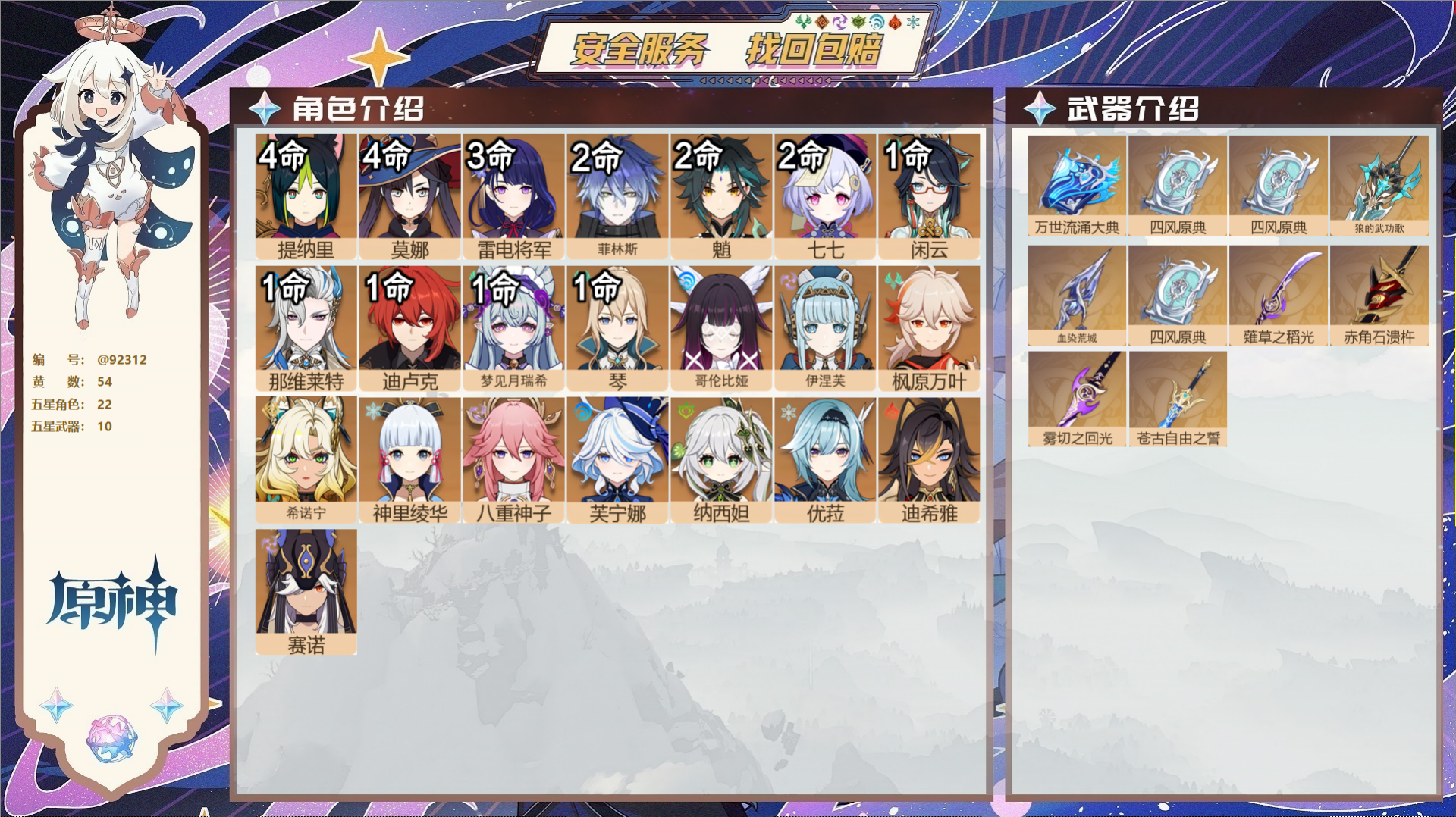 PX_2544486-,未绑定邮箱,,冒险等级60级,女主,54黄,22个五星角色,10个五星武器,纠缠之源0--原石3001--圣遗物1897--【时装】,聆雨听竹,雨化竹身,叶隐芳名, 【22个五星角色】,4命提纳里,4命莫娜,3命雷电将军,2命菲林斯,2命魈,2命七七,1命闲云,1命那维莱特,1命迪卢克,1命梦见月瑞希,1命琴,0命哥伦比娅,0命伊涅芙,0命枫原万叶,0命希诺宁,0命神里绫华,0命八重神子,0命芙宁娜,0命纳西妲,0命优菈,0命迪希雅,0命赛诺, 【10个五星武器】,精1万世流涌大典,精1四风原典,精1四风原典,精1狼的武功歌,精1血染荒城,精1四风原典,精1薙草之稻光,精1赤角石溃杵,精1雾切之回光,精1苍古自由之誓,3套, 【时装】,聆雨听竹,雨化竹身,叶隐芳名,