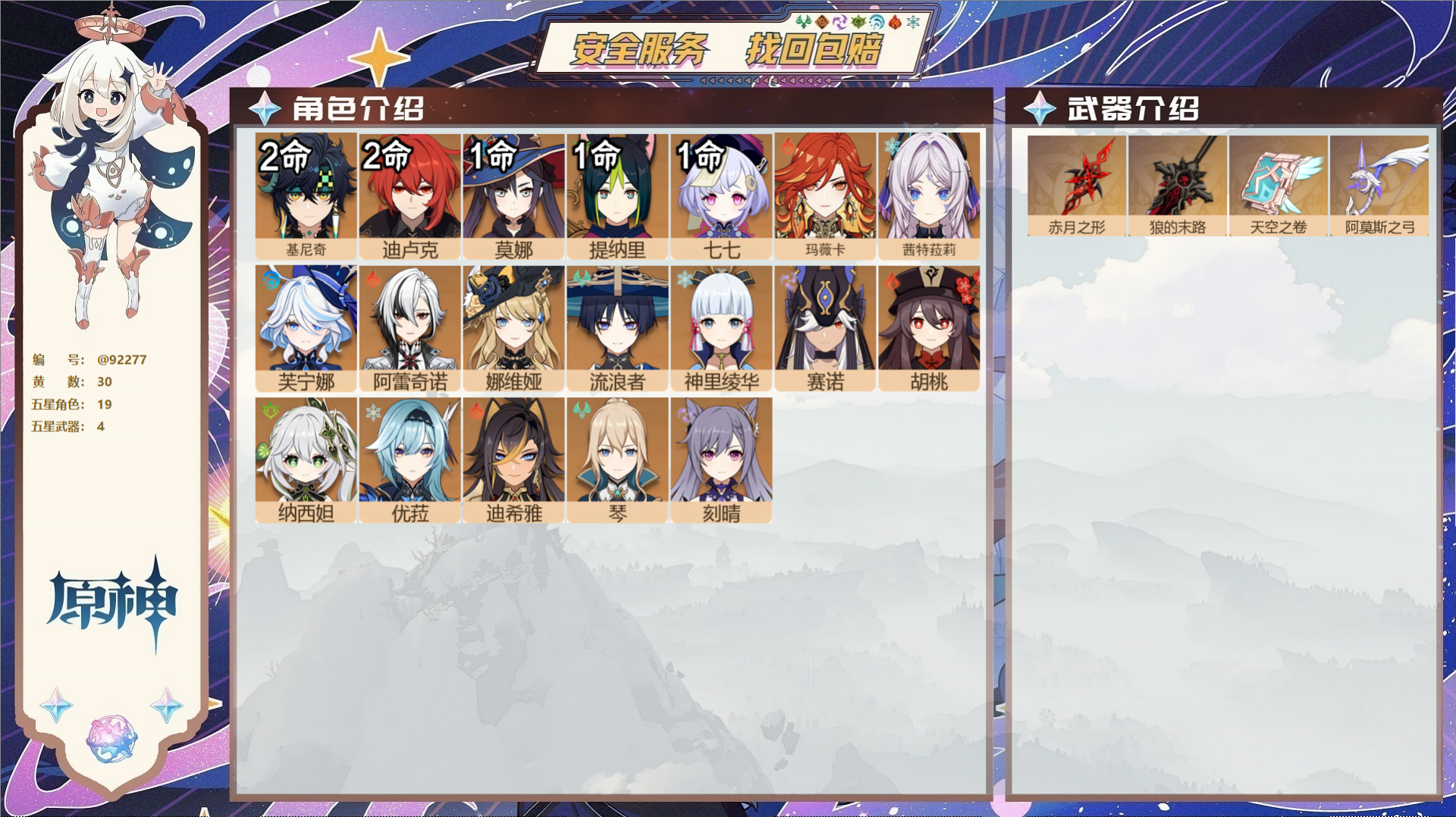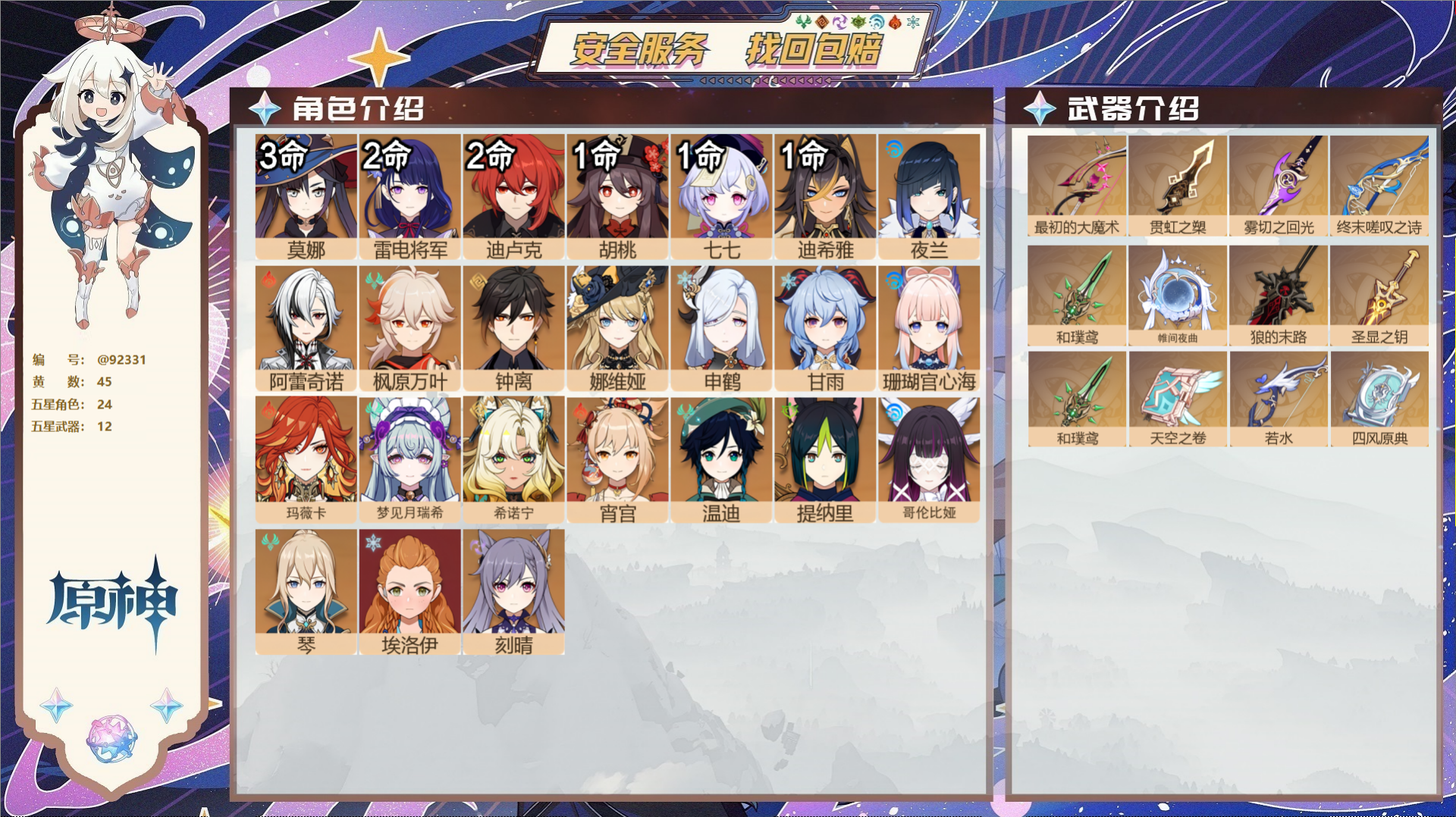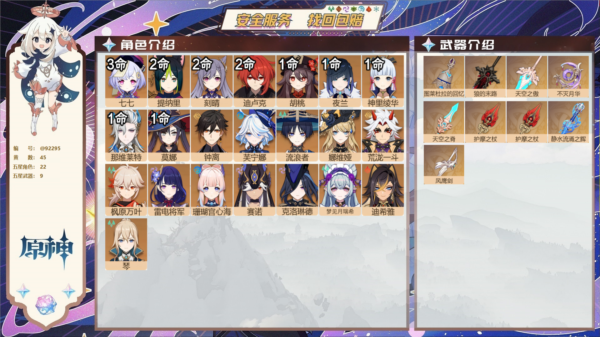 PX_2544463-,邮箱不出售,,冒险等级60级,女主,45黄,22个五星角色,9个五星武器,纠缠之源0--原石126--圣遗物1973--【时装】,叶隐芳名,极夜真梦,帆影游风, 【22个五星角色】,3命七七,2命提纳里,2命刻晴,2命迪卢克,1命胡桃,1命夜兰,1命神里绫华,1命那维莱特,1命莫娜,0命钟离,0命芙宁娜,0命流浪者,0命娜维娅,0命荒泷一斗,0命枫原万叶,0命雷电将军,0命珊瑚宫心海,0命赛诺,0命克洛琳德,0命梦见月瑞希,0命迪希雅,0命琴, 【9个五星武器】,精1图莱杜拉的回忆,精1狼的末路,精1天空之傲,精1不灭月华,精1天空之脊,精1护摩之杖,精1护摩之杖,精1静水流涌之辉,精1风鹰剑,3套, 【时装】,叶隐芳名,极夜真梦,帆影游风,