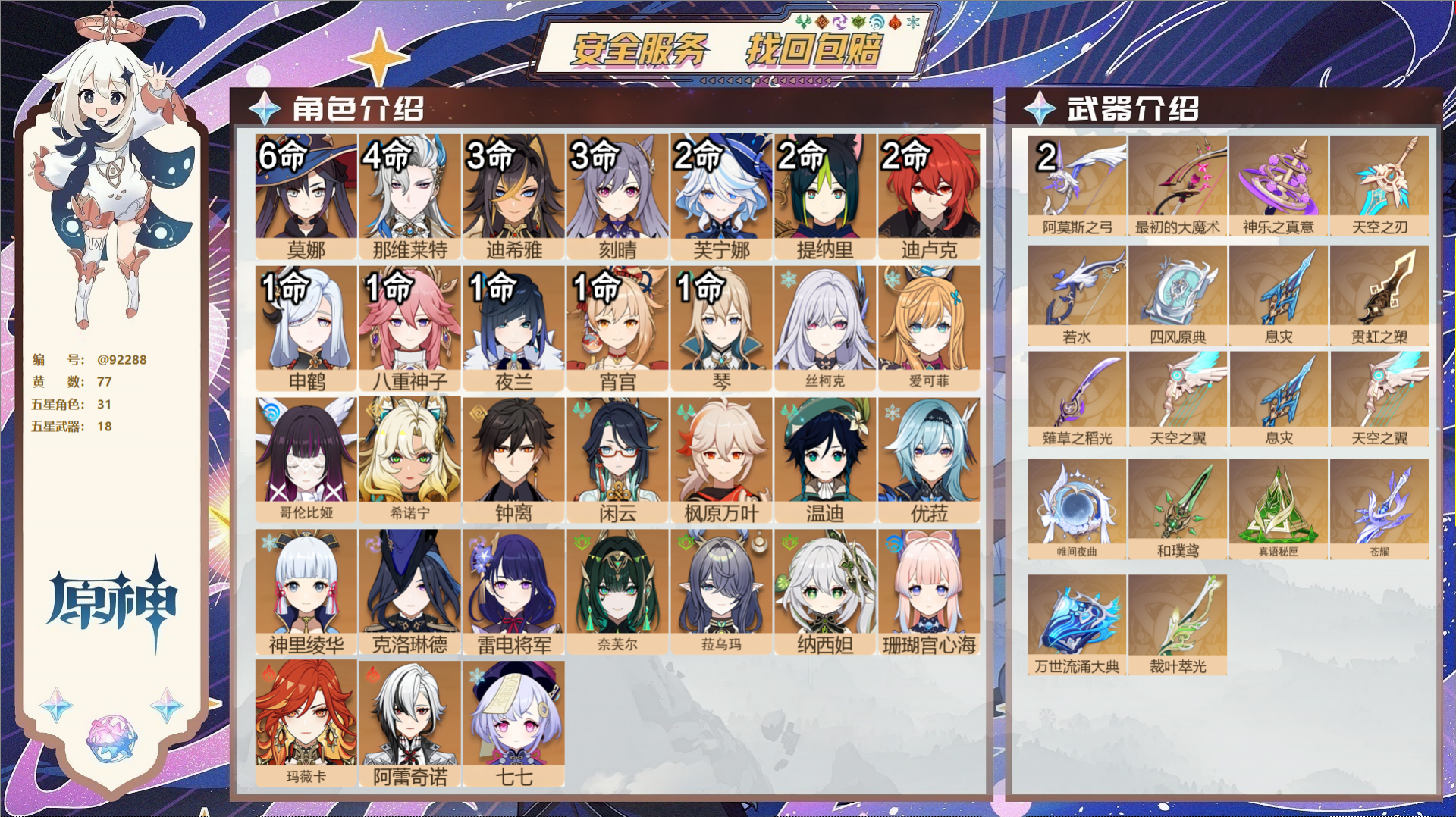 PX_2544454-,邮箱不出售,不送TAP,冒险等级60级,女主,77黄,31个五星角色,18个五星武器,纠缠之源0--原石85--圣遗物935--【时装】,聆雨听竹,炽绘奇旅,叶隐芳名,岁夜欢哗,雨化竹身,花时来信,极夜真梦,冷花幽露,帆影游风,倩影游侠, 【31个五星角色】,满命莫娜,4命那维莱特,3命迪希雅,3命刻晴,2命芙宁娜,2命提纳里,2命迪卢克,1命申鹤,1命八重神子,1命夜兰,1命宵宫,1命琴,0命丝柯克,0命爱可菲,0命哥伦比娅,0命希诺宁,0命钟离,0命闲云,0命枫原万叶,0命温迪,0命优菈,0命神里绫华,0命克洛琳德,0命雷电将军,0命奈芙尔,0命菈乌玛,0命纳西妲,0命珊瑚宫心海,0命玛薇卡,0命阿蕾奇诺,0命七七, 【18个五星武器】,精2阿莫斯之弓,精1最初的大魔术,精1神乐之真意,精1天空之刃,精1若水,精1四风原典,精1息灾,精1贯虹之槊,精1薙草之稻光,精1天空之翼,精1息灾,精1天空之翼,精1帷间夜曲,精1和璞鸢,精1真语秘匣,精1苍耀,精1万世流涌大典,精1裁叶萃光,10套, 【时装】,聆雨听竹,炽绘奇旅,叶隐芳名,岁夜欢哗,雨化竹身,花时来信,极夜真梦,冷花幽露,帆影游风,倩影游侠,