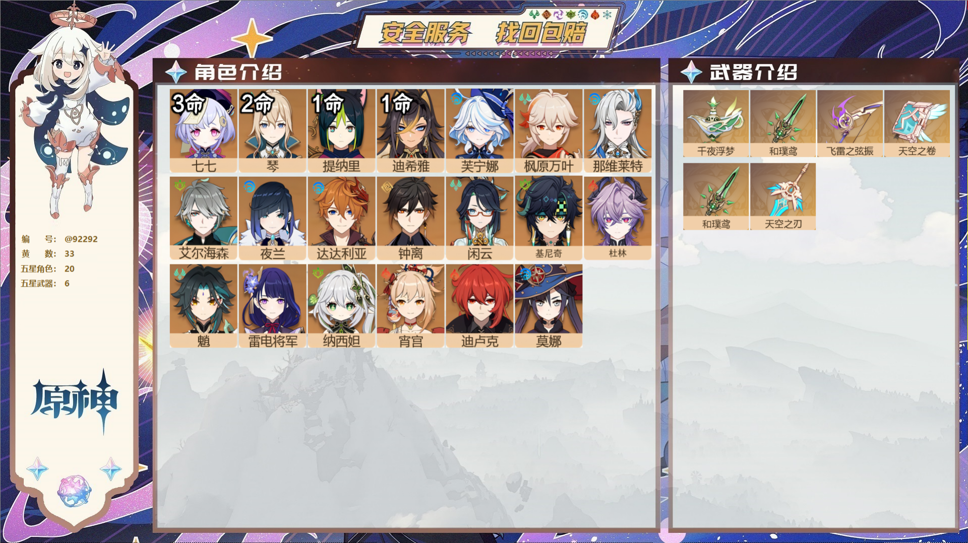 PX_2544460-,未绑定邮箱,,冒险等级59级,女主,33黄,20个五星角色,6个五星武器,纠缠之源0--原石80--圣遗物437--【时装】,叶隐芳名,雨化竹身,倩影游侠,帆影游风, 【20个五星角色】,3命七七,2命琴,1命提纳里,1命迪希雅,0命芙宁娜,0命枫原万叶,0命那维莱特,0命艾尔海森,0命夜兰,0命达达利亚,0命钟离,0命闲云,0命基尼奇,0命杜林,0命魈,0命雷电将军,0命纳西妲,0命宵宫,0命迪卢克,0命莫娜, 【6个五星武器】,精1千夜浮梦,精1和璞鸢,精1飞雷之弦振,精1天空之卷,精1和璞鸢,精1天空之刃,4套, 【时装】,叶隐芳名,雨化竹身,倩影游侠,帆影游风,