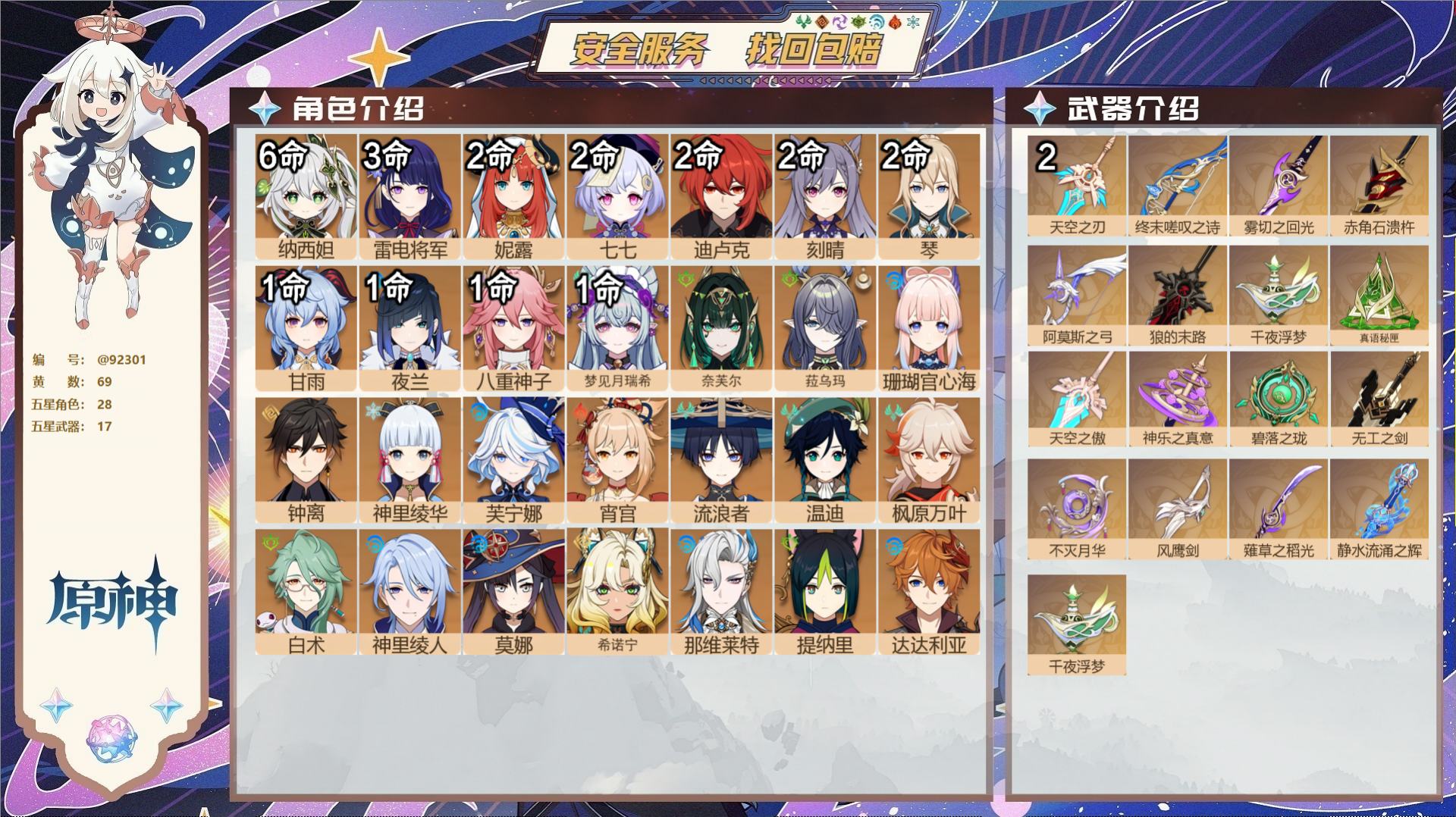 PX_2544476-,邮箱不出售,,冒险等级58级,男主,69黄,28个五星角色,17个五星武器,纠缠之源0--原石3015--圣遗物897--【时装】,叶隐芳名,极夜真梦, 【28个五星角色】,满命纳西妲,3命雷电将军,2命妮露,2命七七,2命迪卢克,2命刻晴,2命琴,1命甘雨,1命夜兰,1命八重神子,1命梦见月瑞希,0命奈芙尔,0命菈乌玛,0命珊瑚宫心海,0命钟离,0命神里绫华,0命芙宁娜,0命宵宫,0命流浪者,0命温迪,0命枫原万叶,0命白术,0命神里绫人,0命莫娜,0命希诺宁,0命那维莱特,0命提纳里,0命达达利亚, 【17个五星武器】,精2天空之刃,精1终末嗟叹之诗,精1雾切之回光,精1赤角石溃杵,精1阿莫斯之弓,精1狼的末路,精1千夜浮梦,精1真语秘匣,精1天空之傲,精1神乐之真意,精1碧落之珑,精1无工之剑,精1不灭月华,精1风鹰剑,精1薙草之稻光,精1静水流涌之辉,精1千夜浮梦,2套, 【时装】,叶隐芳名,极夜真梦,