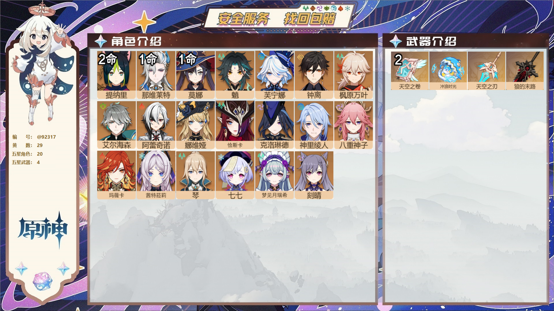 PX_2544492-,未绑定邮箱,,冒险等级58级,女主,29黄,20个五星角色,4个五星武器,纠缠之源0--原石60--圣遗物295--【时装】,倩影游侠,炽绘奇旅,岁夜欢哗,雨化竹身,帆影游风, 【20个五星角色】,2命提纳里,1命那维莱特,1命莫娜,0命魈,0命芙宁娜,0命钟离,0命枫原万叶,0命艾尔海森,0命阿蕾奇诺,0命娜维娅,0命恰斯卡,0命克洛琳德,0命神里绫人,0命八重神子,0命玛薇卡,0命茜特菈莉,0命琴,0命七七,0命梦见月瑞希,0命刻晴, 【4个五星武器】,精2天空之卷,精1冲浪时光,精1天空之刃,精1狼的末路,5套, 【时装】,倩影游侠,炽绘奇旅,岁夜欢哗,雨化竹身,帆影游风,