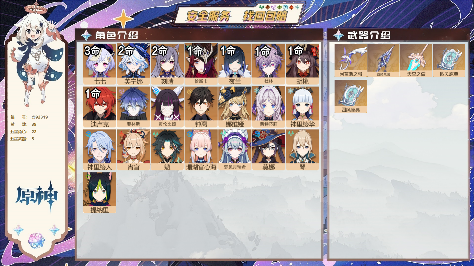PX_2544495-,邮箱不出售,,冒险等级60级,男主,39黄,22个五星角色,5个五星武器,纠缠之源0--原石124--圣遗物625--【时装】,帆影游风,岁夜欢哗,雨化竹身,叶隐芳名, 【22个五星角色】,3命七七,2命芙宁娜,2命刻晴,1命恰斯卡,1命夜兰,1命杜林,1命胡桃,1命迪卢克,0命菲林斯,0命哥伦比娅,0命钟离,0命娜维娅,0命茜特菈莉,0命神里绫华,0命神里绫人,0命宵宫,0命魈,0命珊瑚宫心海,0命梦见月瑞希,0命莫娜,0命琴,0命提纳里, 【5个五星武器】,精1阿莫斯之弓,精1血染荒城,精1天空之傲,精1四风原典,精1四风原典,4套, 【时装】,帆影游风,岁夜欢哗,雨化竹身,叶隐芳名,