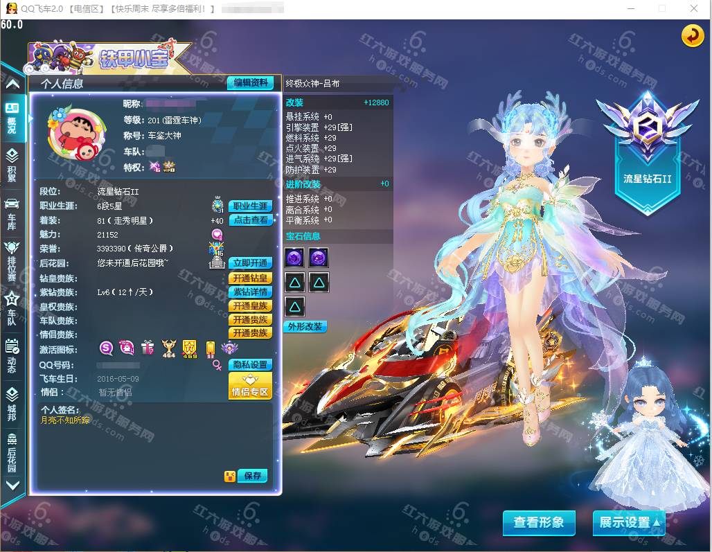 DS0880【电信一区】等级201级,鱼夜情缘男/昼宇星辰女/清风拂柳女/山海秋神女/,魅力18W,荣誉1442W,紫钻7,皇族6,S车*13;双四至尊火鲤+29,双四爆天曜影10阶+29,双四至尊涅槃+29,双四爆天雷诺+29,爆天雪+29,爆天电魔,至尊盘龙,终极爆天甲,终极众神之神,黑域电魔,闪电风暴,圣骑士,风之使者,T2;孙悟空,A车*24,坐骑*9,宠物*25,骑宠*21;神笔牛牛+10,梅灵婉香+10,小吕布+9,套装男62页,套装女24页,36666R,